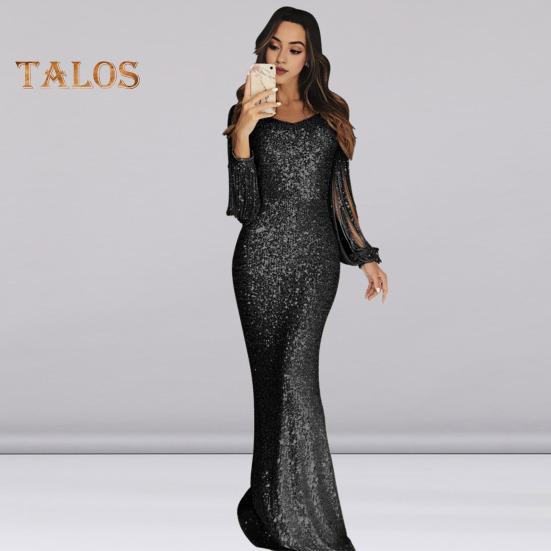 Женское платье для выпускного вечера с кисточками и рукавами-футляром, облегающее платье с V-образным вырезом, однотонное вечернее платье с блестками и рыбьим хвостом, коктейльное платье макси