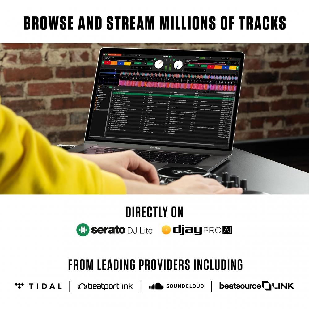 [Потоковое воспроизведение] Если вы получаете доступ к SoundCloud Go+/Beatport Link/Beatsource Link/TIDAL и т. д.. от Serato DJ Lite (включены) или djay Pro AI, вы можете немедленно включить обширный музыкальный контент в диджейский микс (Правила использования различных потоковых сервисов и пробные периоды могут различаться в зависимости от страны.