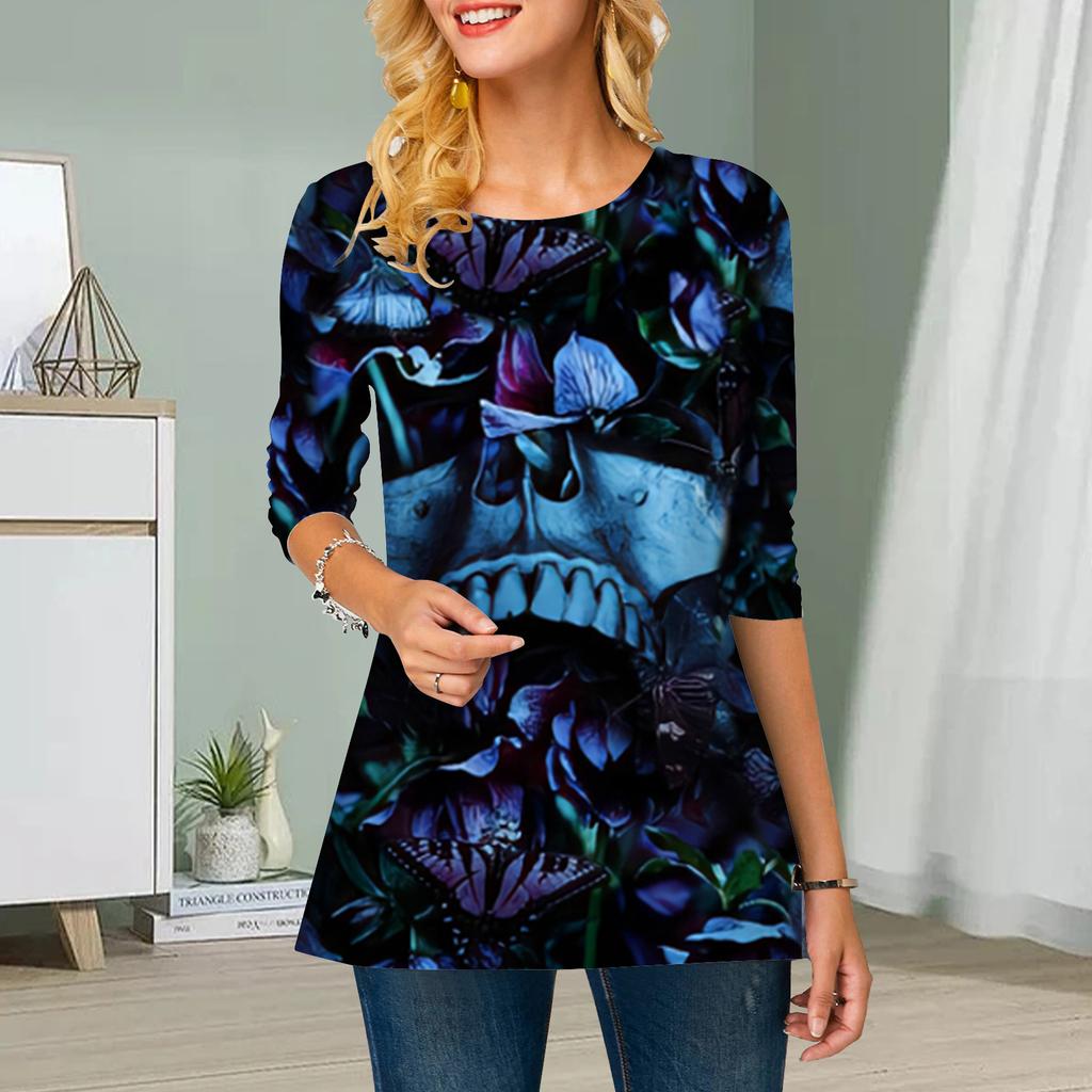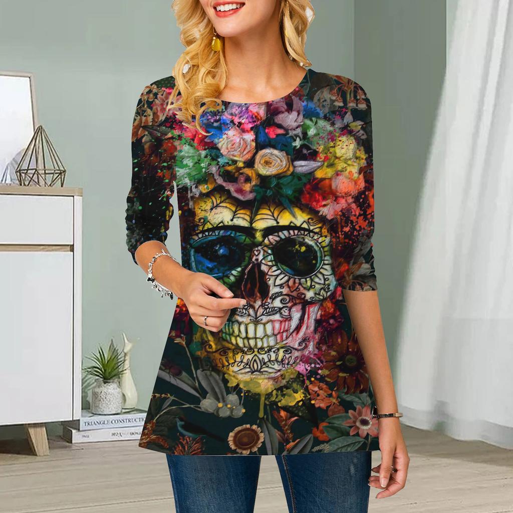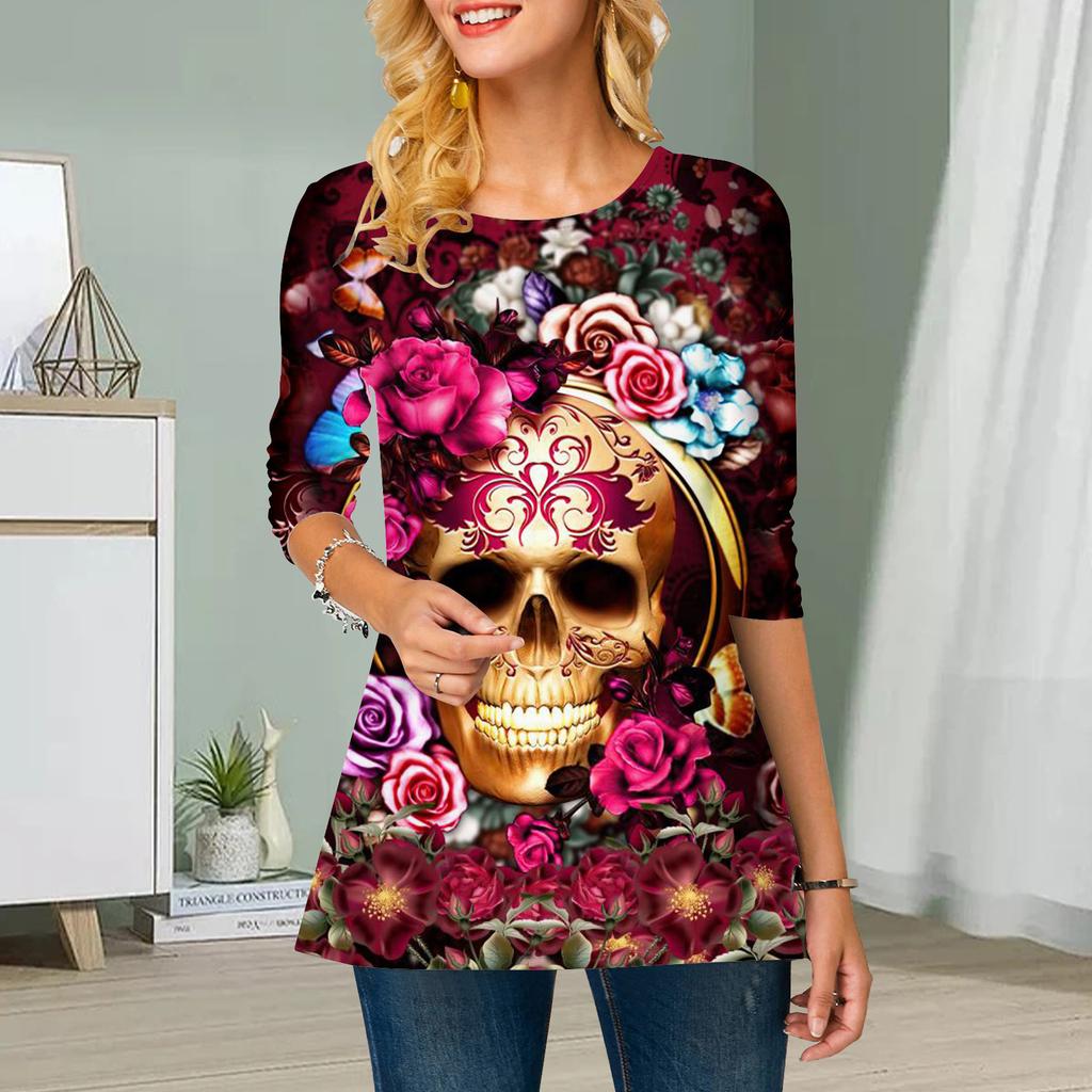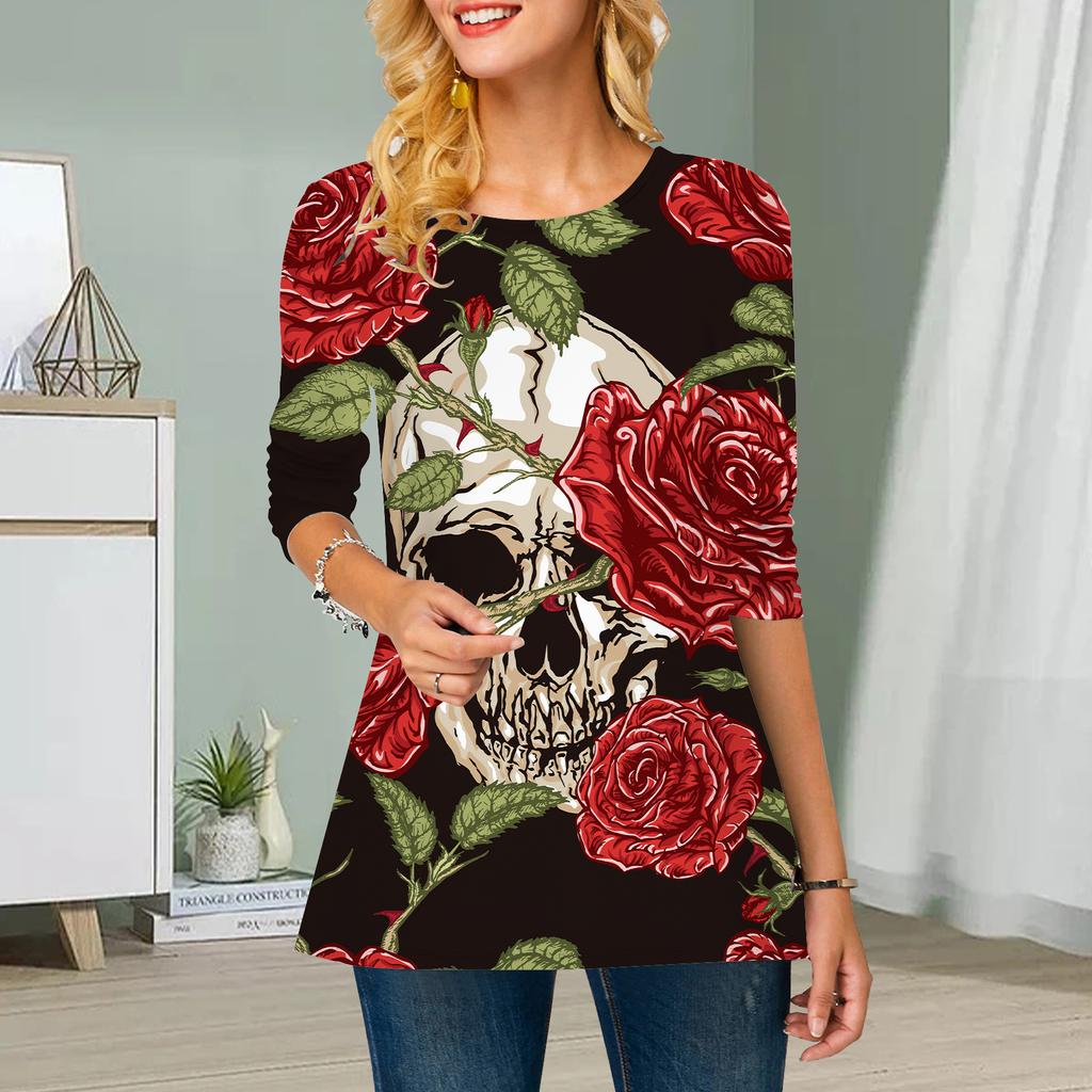 Плюс Размер Женский Цветочный Скелет Роза Принт Круглый Вырез Повседневный Свободный Длинный Рукав Топ