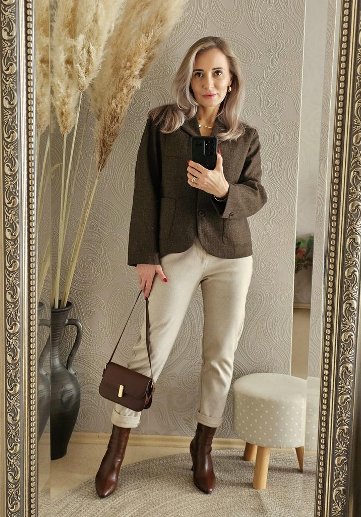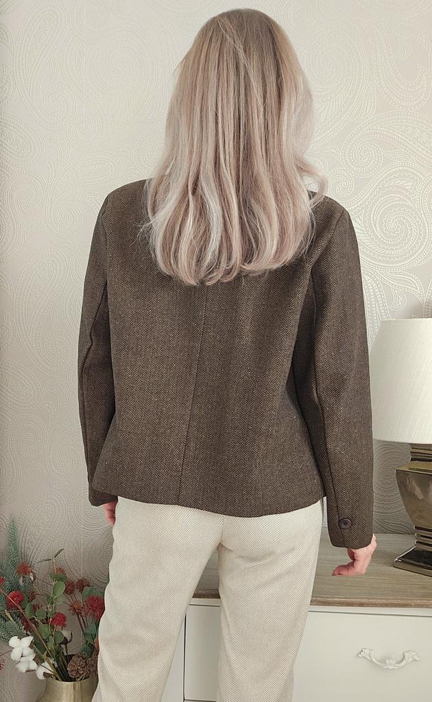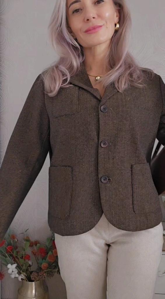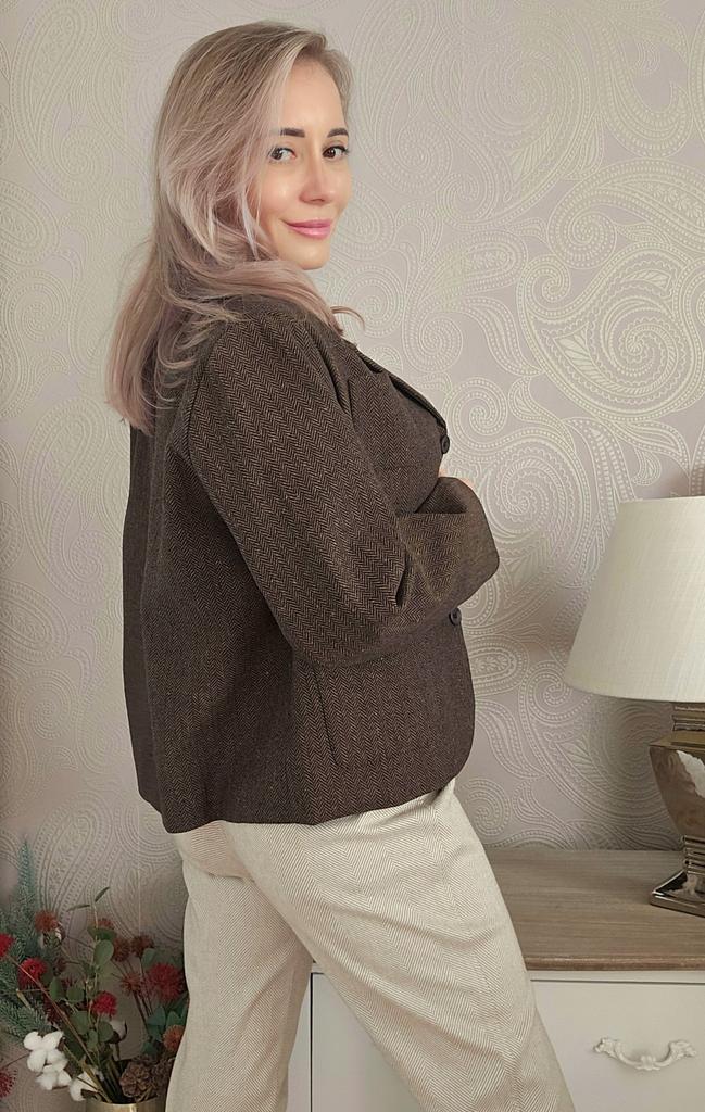 Короткий жакет прямого кроя в ретро стиле от 21Top 🤎 Все детали смотрите на видео 📽 Отличный повседневный жакет в актуальном шоколадном цвете в ёлочку. Плотный материал из хлопка, визуально под шерсть хорошо держит форму, приятный на ощупь. Подклад из атласного полиэстера в чёрном цвете. Отлчно подойдёт на тёплую осень или весну и зимой под пальто. Прямой крой с закруглённым передом. Есть два небольших накладных кармана и один маленький нагрудный. Застегивается на три пуговицы. На руковах декоративные пуговицы. Мои параметры 90-65-90см, рост 156см. Нв мне размер XL. Жакет сел комфортно, свободно, с небольшим запасом в груди, бёдрах и талии. Все замеры на моём фото, листайте. Качество отличное. Выполнено всё ровно и аккуратно. Есть этикетки на китайском языке. Всем хороших покупок! Ваша Инга 😘