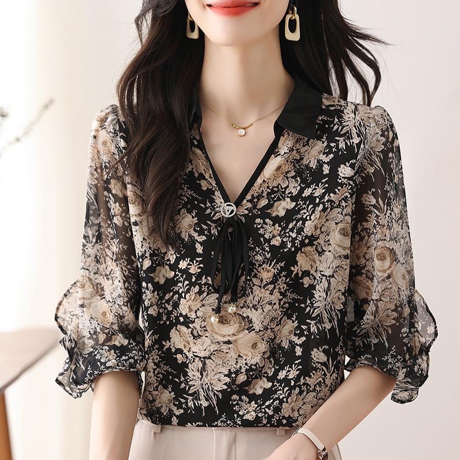 Элегантная и модная рубашка из шифона с цветочным принтом для женщин среднего возраста на весну