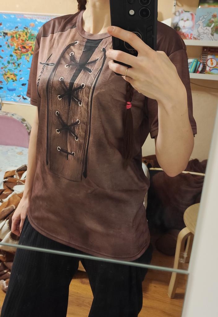 Цвет коричневый, теплый. Не как на фото. Ткань прям синтетика-синтетика. Печать средненького качества. На мужа чуть маловата. Л на ОГ 98 см- маловат. На мой 92 см- нормально. Берите с учётом этого.