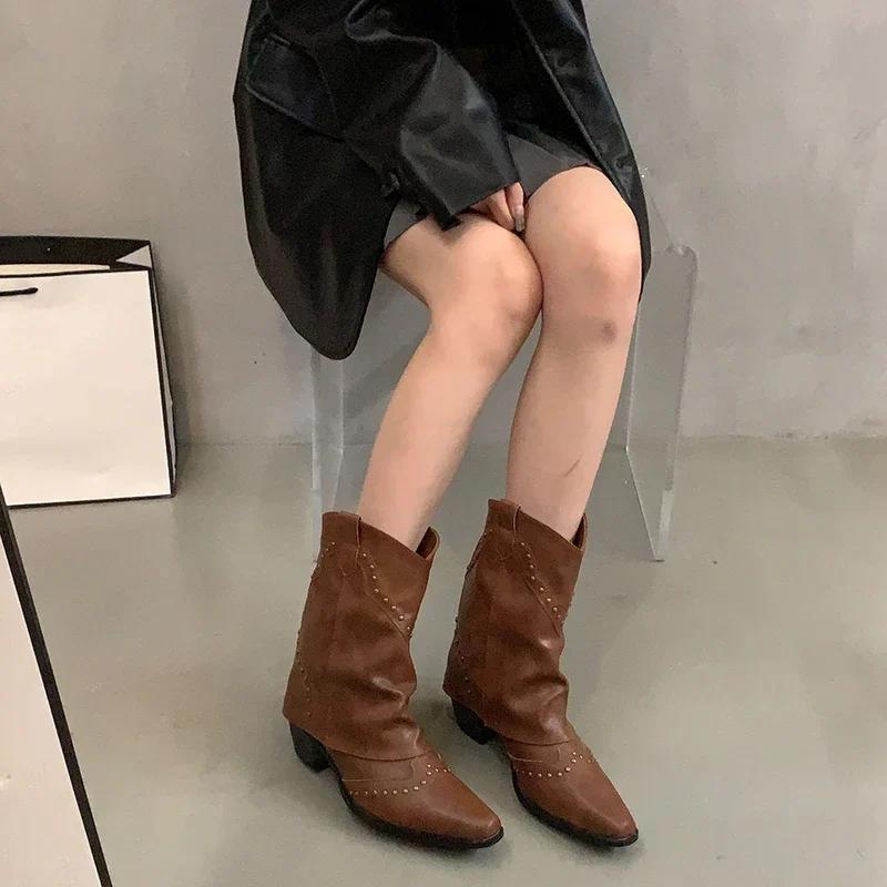 Осень-зима женские брюки короткие сапоги ретро стиль вестерн рыцарские сапоги острый нос квадратный каблук женские туфли