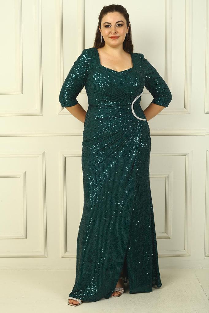 Длинное платье больших размеров с рукавами три четверти, драпировкой спереди и блестками