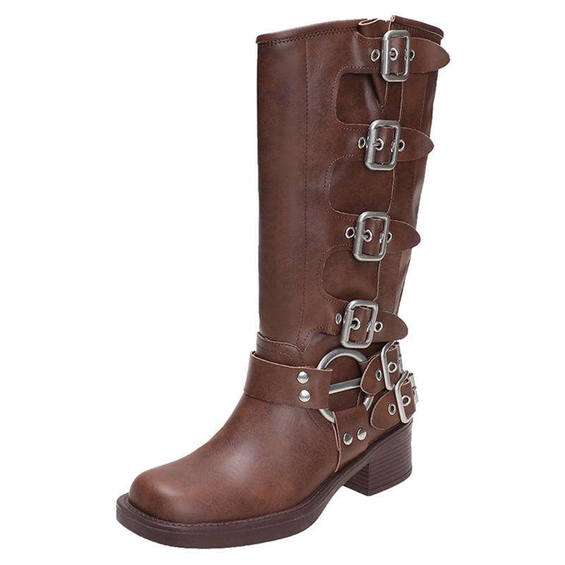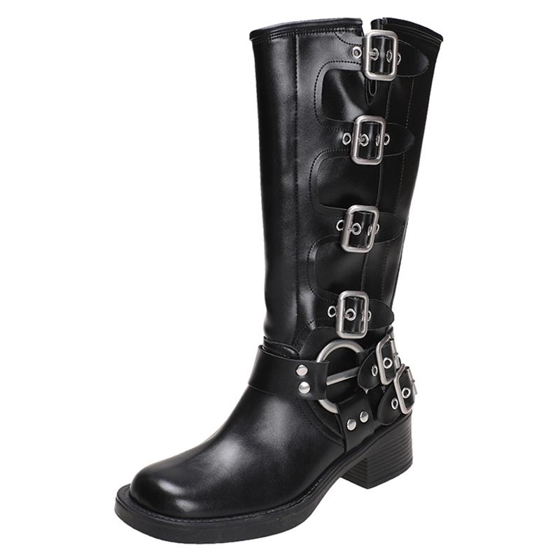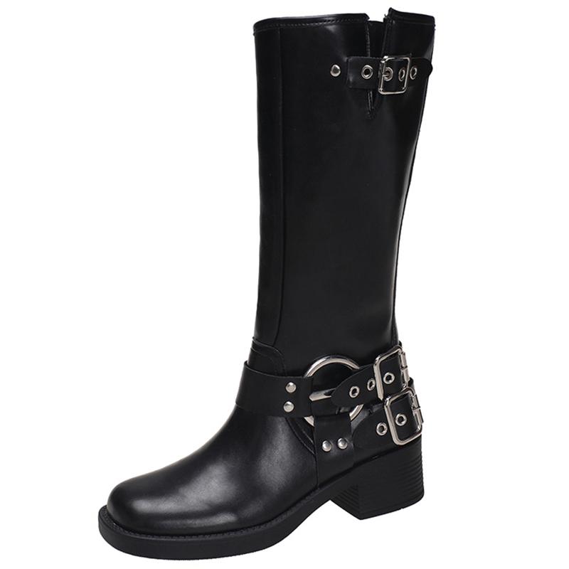 Модные сапоги до колена с металлической пряжкой и квадратным носком, женские черные панк-сапоги из искусственной кожи, женские, осень 2024, толстые каблуки, мотоциклетные сапоги