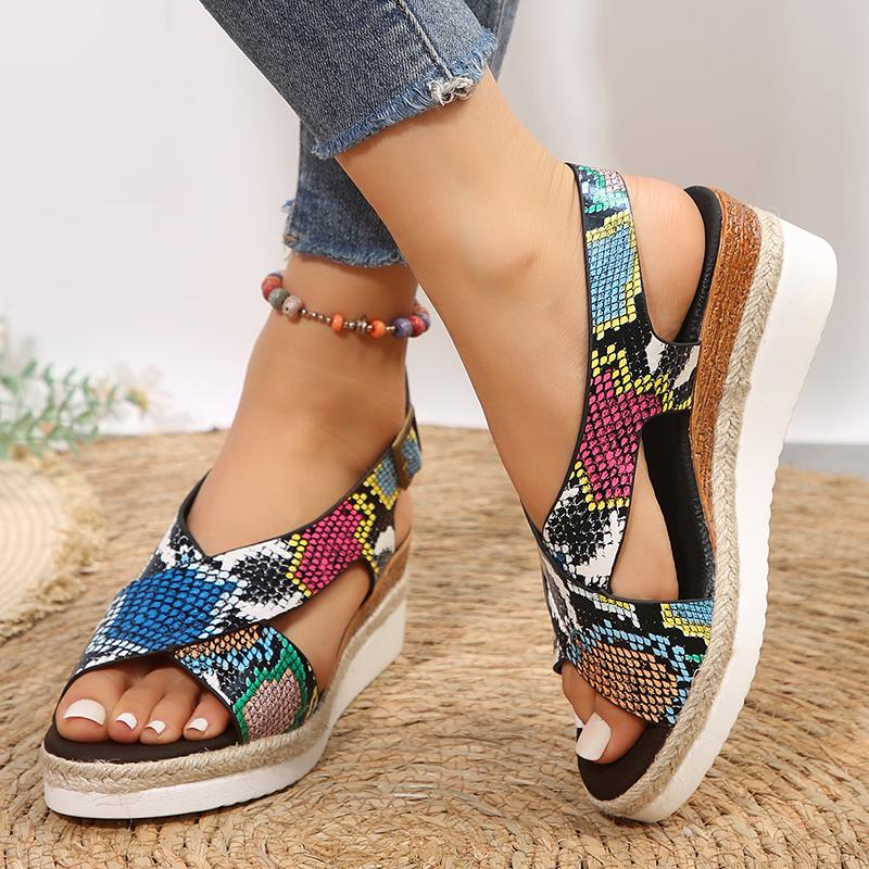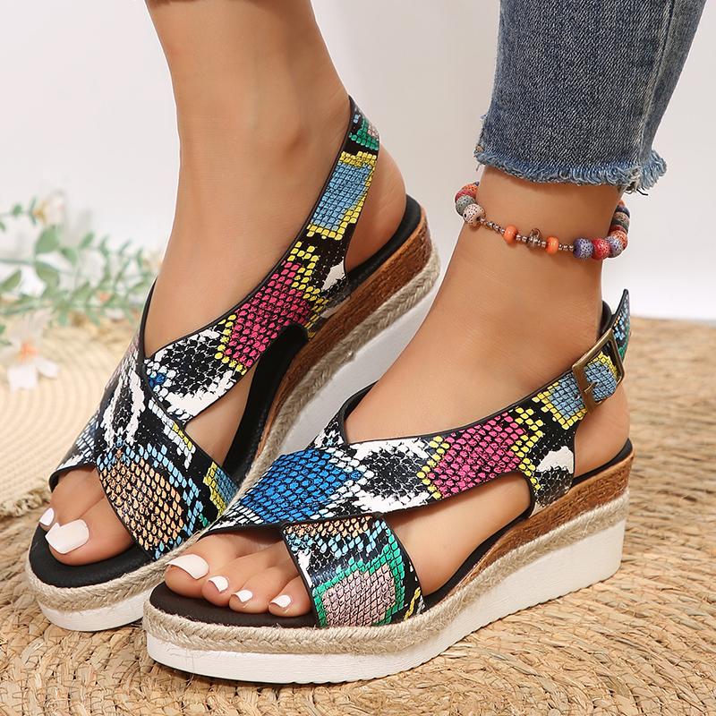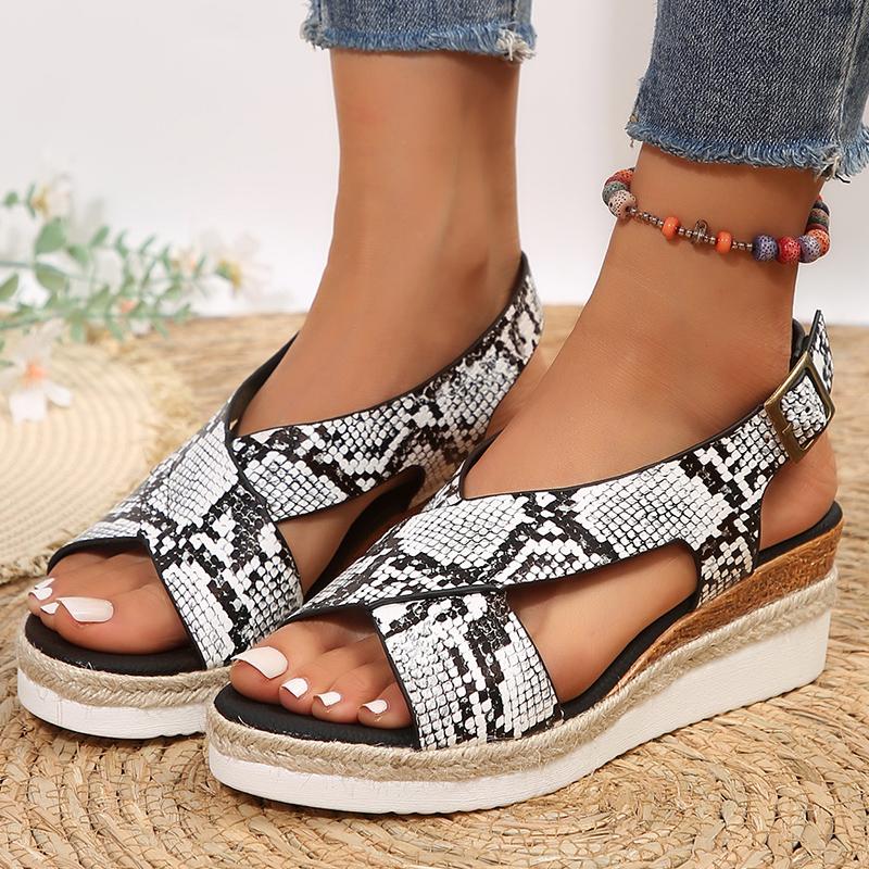 Модные сексуальные сандалии из змеиной кожи для женщин на танкетке, летние модные повседневные туфли с пряжкой и ремешком, пляжные сандалии с перекрестными ремешками
