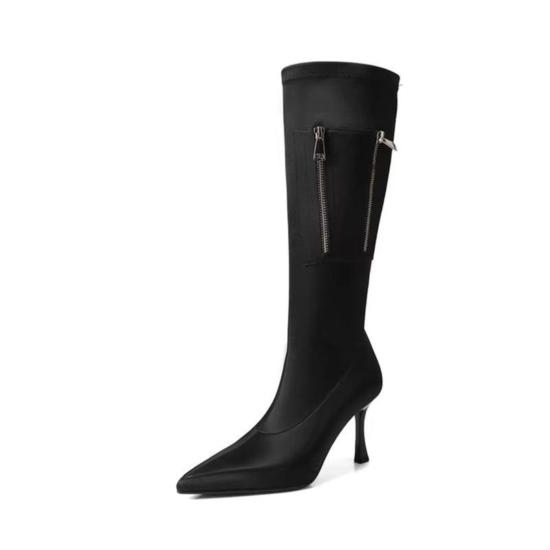 Модные женские сапоги из искусственной замши на тонком каблуке, высокие сапоги до колена, классические черные сапоги с заостренным носком на молнии, зимние и осенние туфли на шпильках