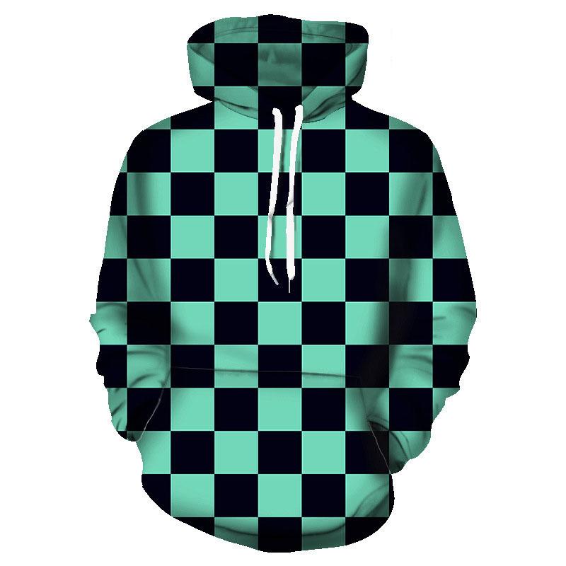 Мужская толстовка с капюшоном с 3D-принтом и персонажами аниме, универсальная зеленая черная клетчатая кофта Kamado Tanjirou, повседневная толстовка 3xl с длинным рукавом
