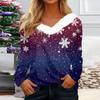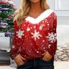 Женская мода с длинным рукавом, рождественский принт, плюшевый ворот, V-образный вырез, пуловер, топ