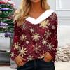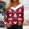 Женская мода с длинным рукавом, рождественский принт, плюшевый ворот, V-образный вырез, пуловер, топ