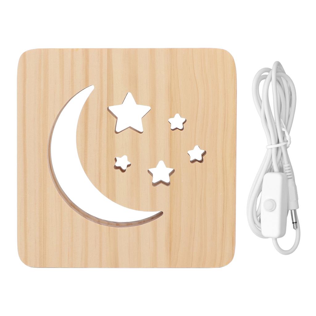 Деревянный 3D светодиодный светильник с рисунком луны и звезд, защита глаз, USB-блок питания, теплый белый ночник f