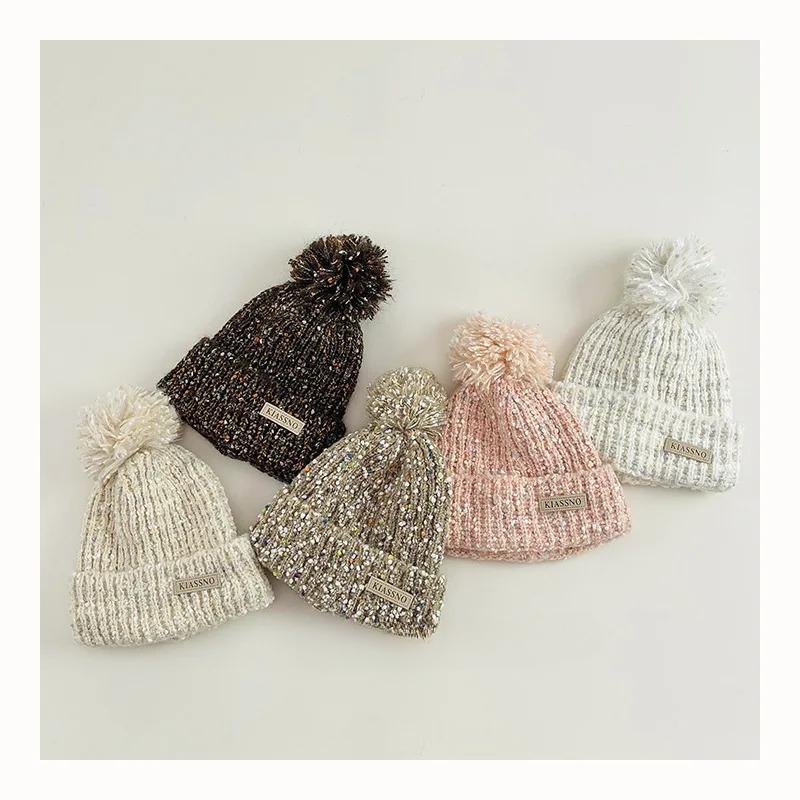 Шикарная теплая детская шапочка для мальчика и девочки, модная ретро вязаная шапка, пушистый шарик, осень-зима, теплая флисовая плюшевая детская вязаная шапочка