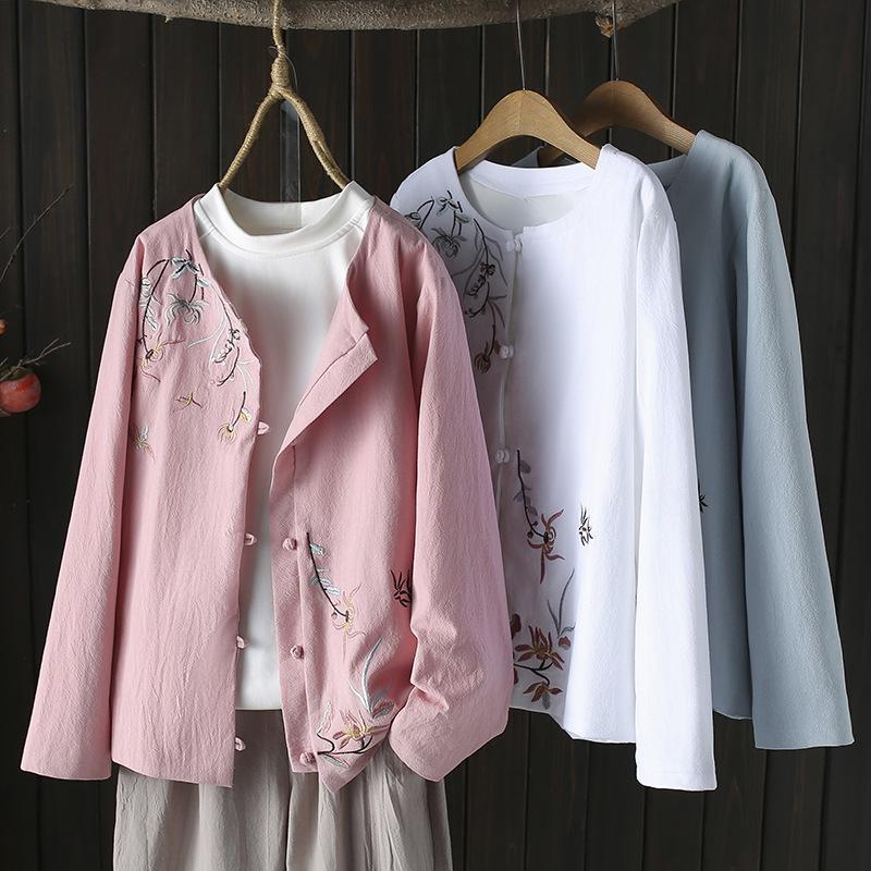Тонкое пальто с вышивкой в китайском стиле с круглым вырезом, женская рубашка больших размеров с длинными рукавами на весну и осень — купить товар онлайн с бесплатной доставкой по всему миру!