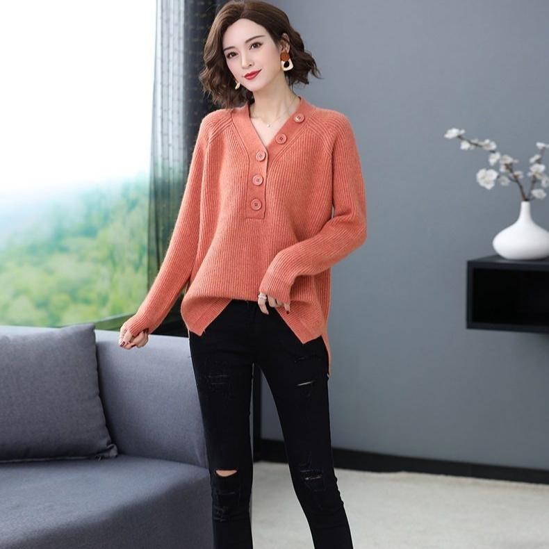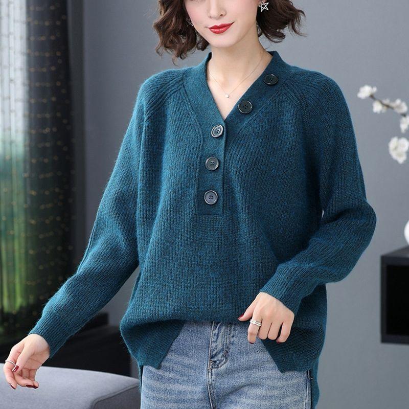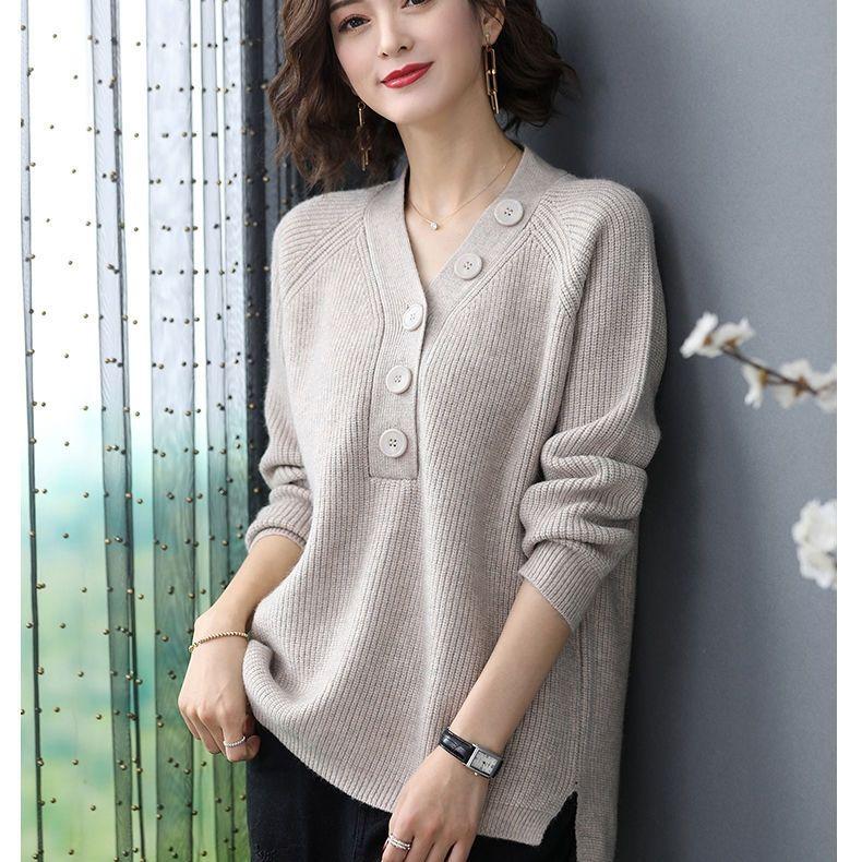 Весенне-осенний женский свитер с V-образным вырезом, свободный свитер большого размера, трикотажный свитер с разрезом, трикотажные топы, джемпер