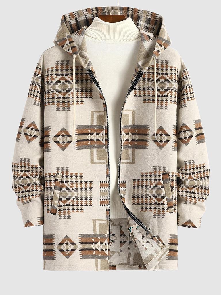 ZAFUL Мужское длинное шерстяное пальто с ацтекским этническим геометрическим принтом, карманом на молнии и капюшоном