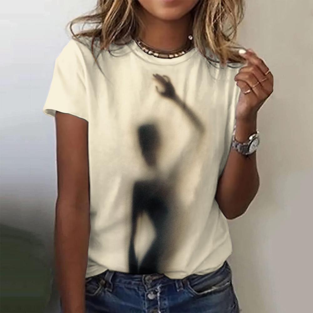 Женские футболки, короткий свитер с рукавами, с принтом в виде теней, модный досуговый стиль, с круглым вырезом, футболка Harajuku, женская одежда