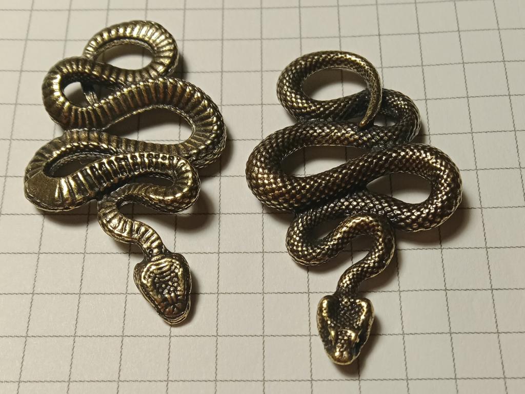 Беру эту змею второй раз. Магазин Diner отправил мне фигурки качеством гораздо лучше, чем магазин Warmya, у которого я заказывала первый раз. Там были излишки металла неотшлифованные. Да и полировка здесь лучше. Погрешность в размерах допустимая - 2мм (3,9х2,3см).