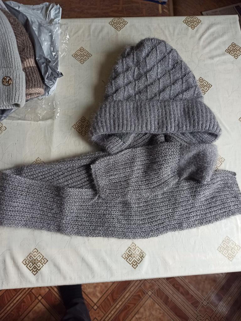 Шапка вообще не соответствует тому,что на фото, узенький шарф,шапка настолько тонкой вязки,что просвечивает какой то немыслимый подклад,и никакого обьема