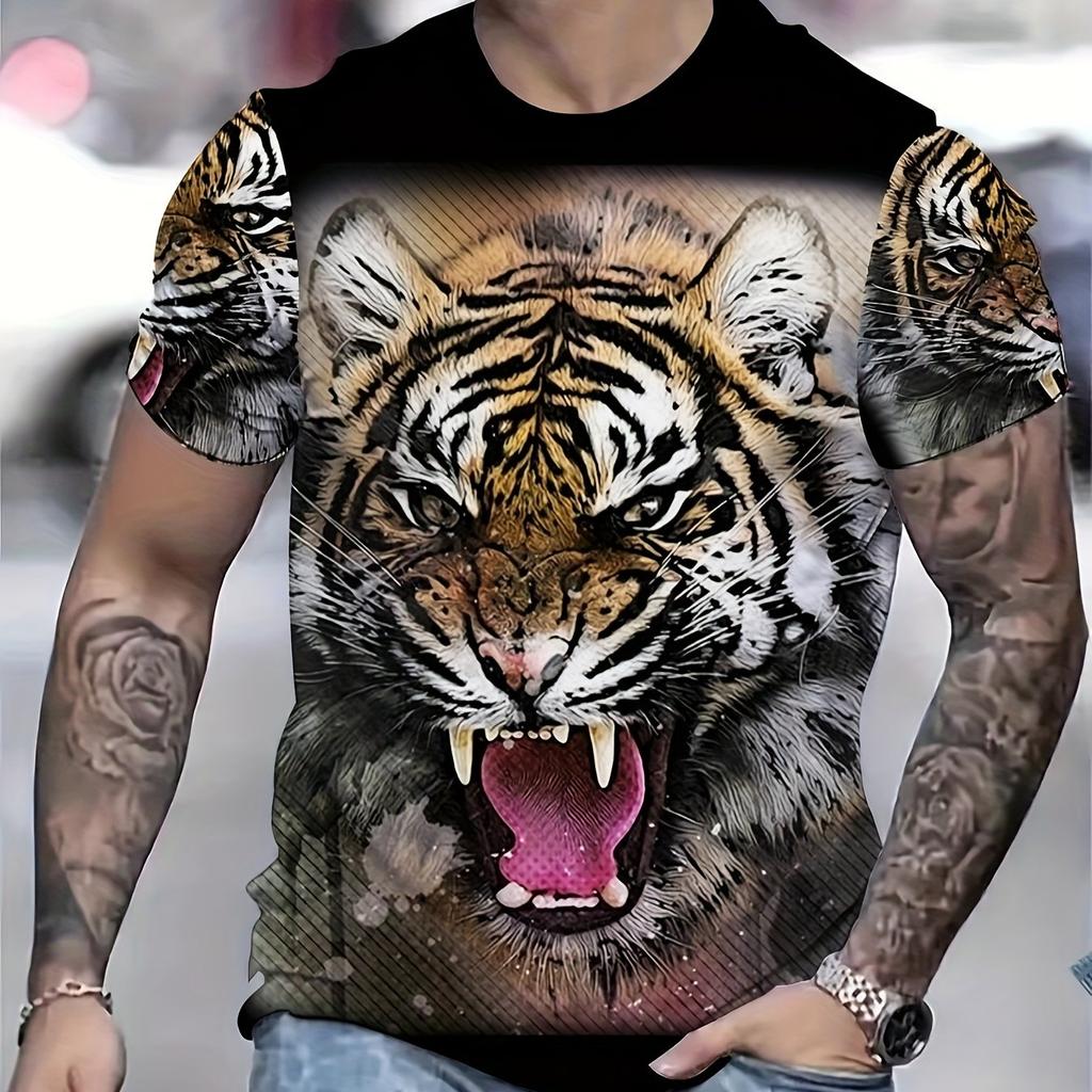 Яркий 3D-графический принт с ревом тигра — короткий рукав, круглый вырез, новинка, летняя футболка для активного отдыха, мужская футболка для повседневной носки