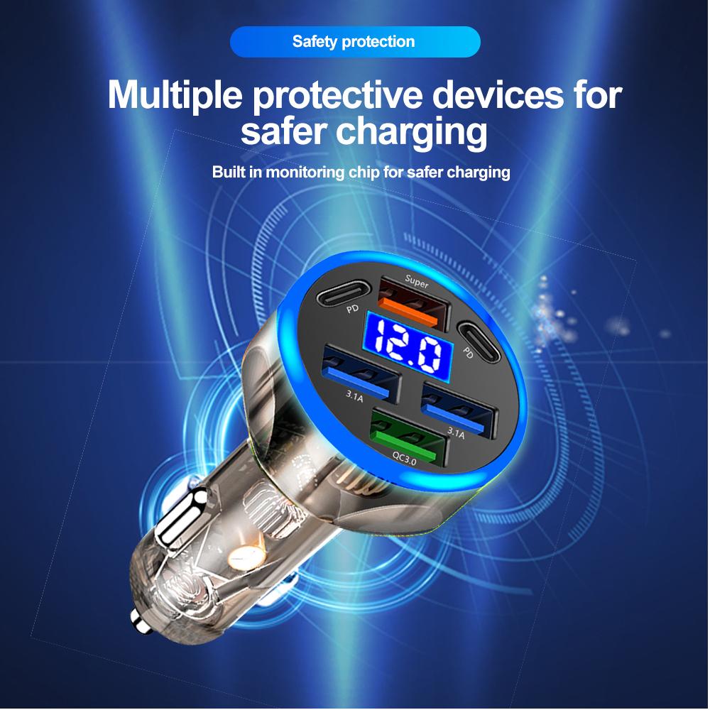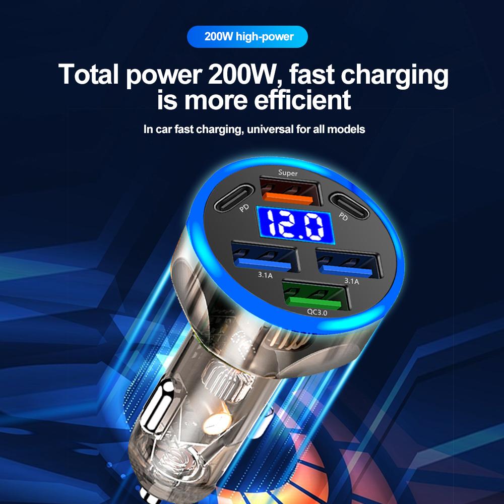 Автомобильное зарядное устройство мощностью 200 Вт с 6 портами USB и Type-C, PD QC3.0, быстрая зарядка для iPhone, Samsung, Huawei, Xiaomi — компактный, огнестойкий дизайн