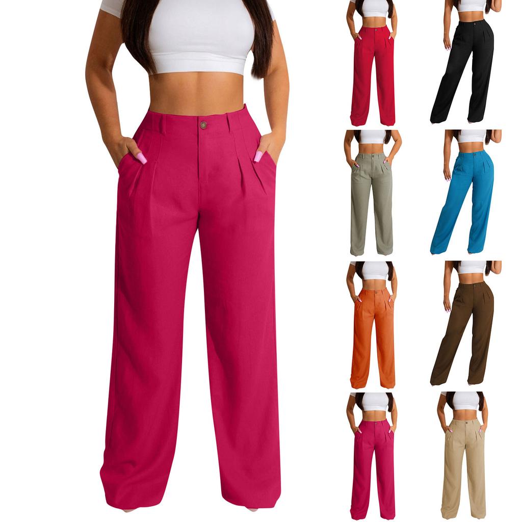 Женские однотонные широкие брюки, длинные брюки, повседневные брюки, плиссированные брюки с высокой талией, свободная талия, повседневные брюки на молнии с пуговицами