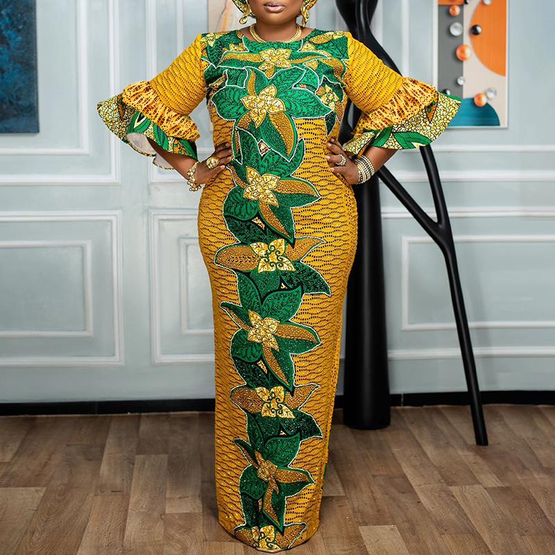 Женские платья больших размеров с круглым вырезом, расклешенные, с длинным рукавом, с принтом
