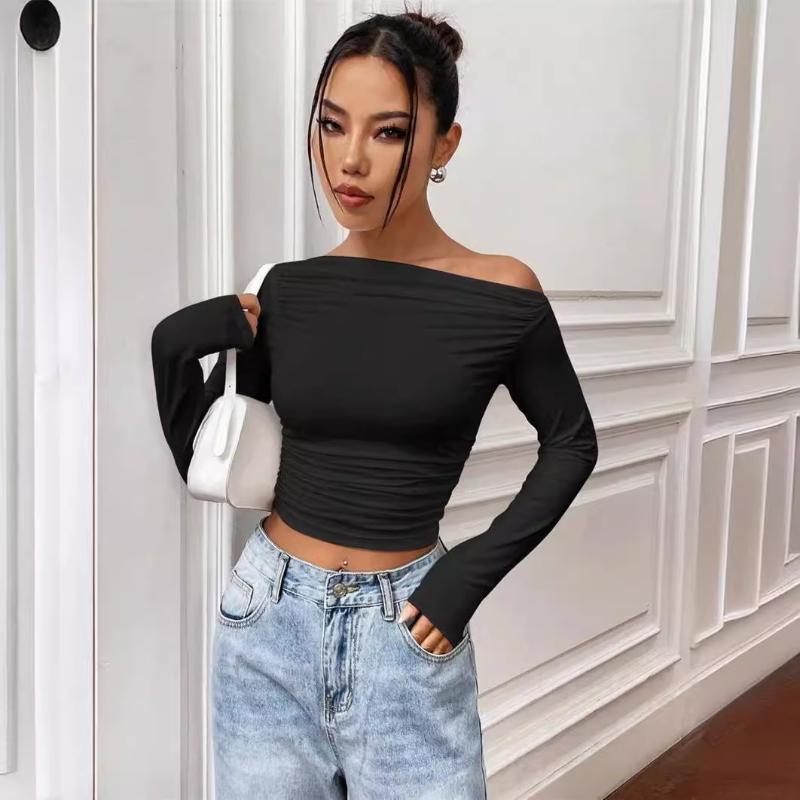 Европейская и американская однотонная футболка с косыми плечами и длинными рукавами, осенняя, острая, модная, для девушек, облегающая футболка — купить товар онлайн с бесплатной доставкой по всему миру!