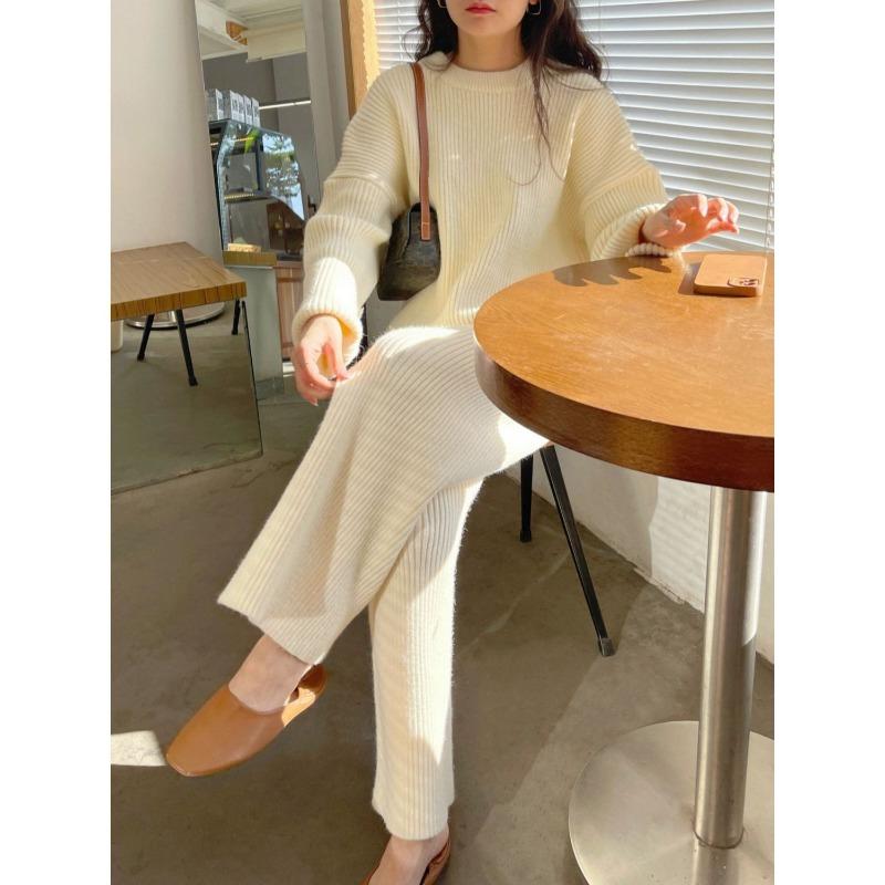 Рисово-белый нежный стиль темпераментный вязаный костюм женский осень и зима новый стиль ленивый стиль широкие брюки свитер ленивый комплект из двух предметов