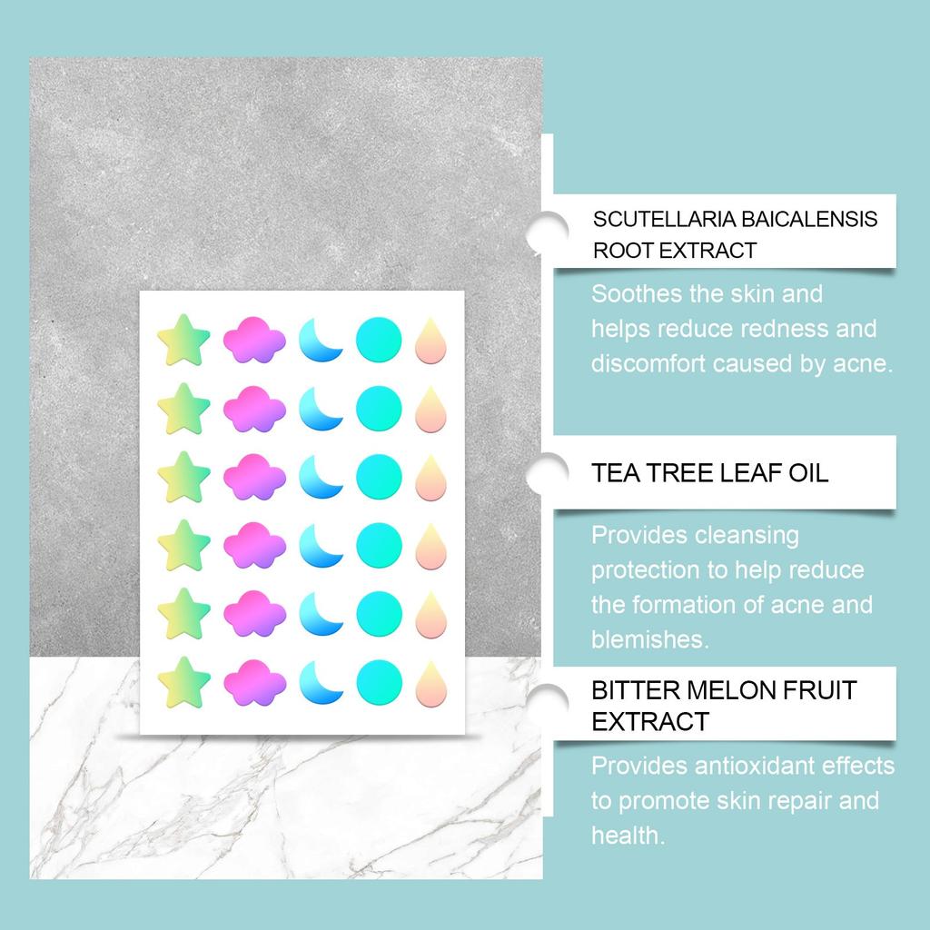 [Различные цвета и размеры]: Пластыри от прыщей поставляются в большой упаковке по 36 шт. Милые пластыри от прыщей помогают впитывать выделения и одновременно скрывать прыщи. Гидроколлоидные пластыри от прыщей, клинически протестированные нашими исследователями, улучшают внешний вид прыщей за ночь, не выскакивая.. Просто наклейте его, впитайте жидкость от прыщей и гной, и кожа станет более чистой.