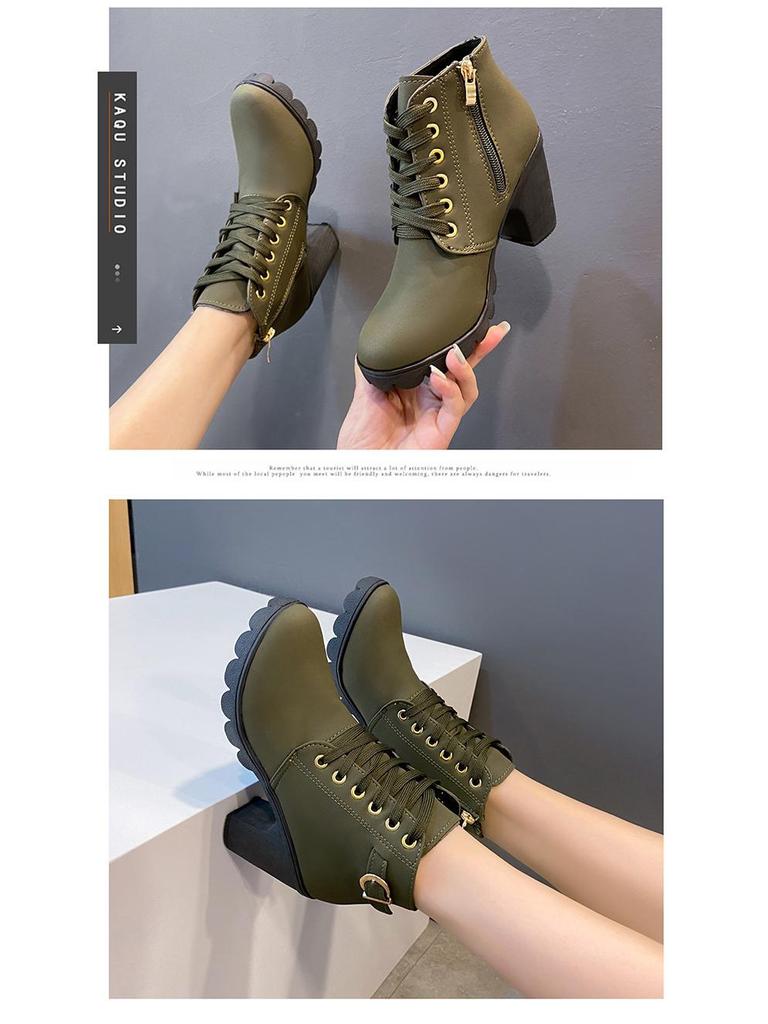 Женские осенние сапоги на высоком каблуке с поясом: Короткие, на толстом каблуке, со шнуровкой, ботинки «Мартин» в стиле рыцарь и босой