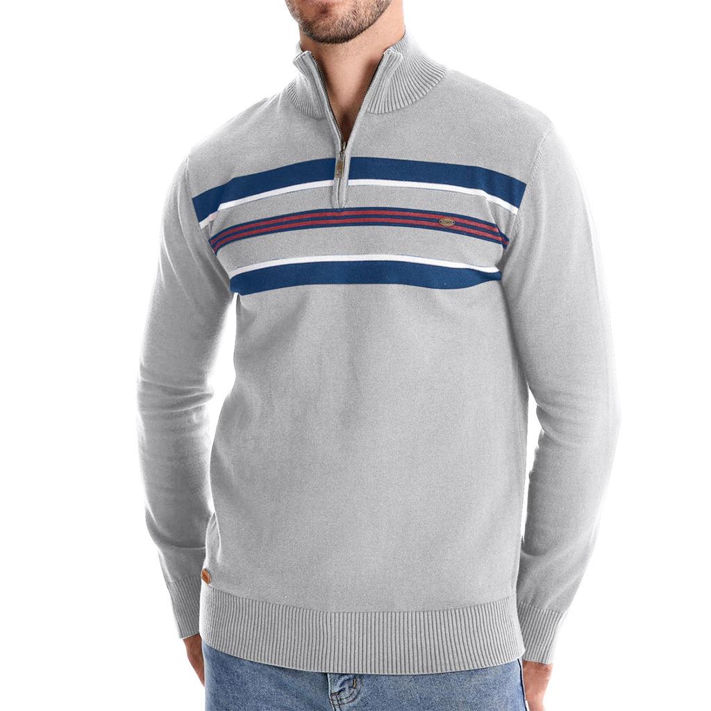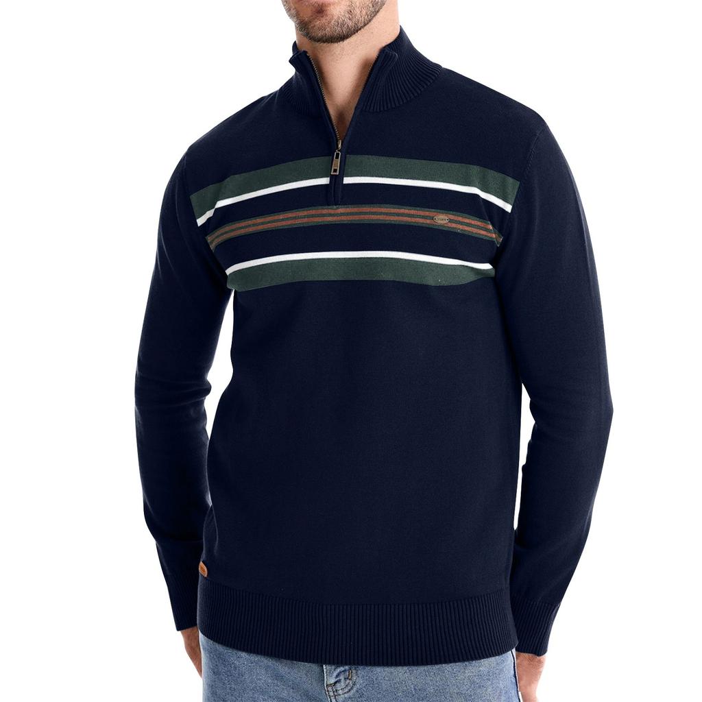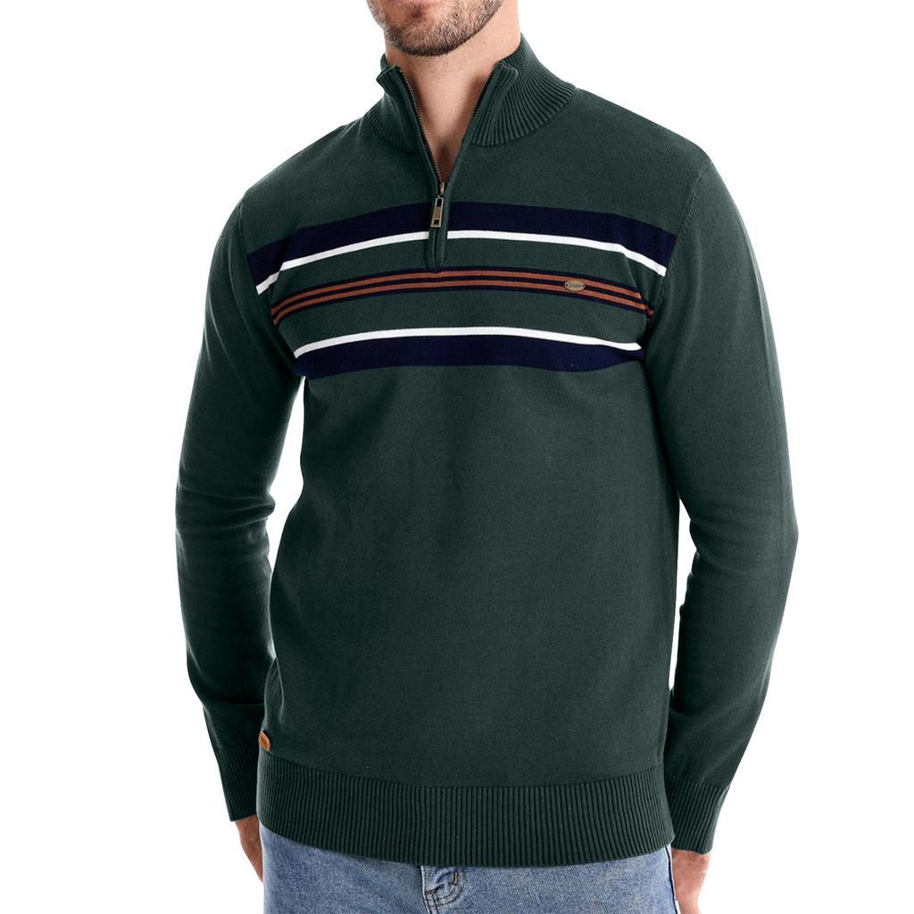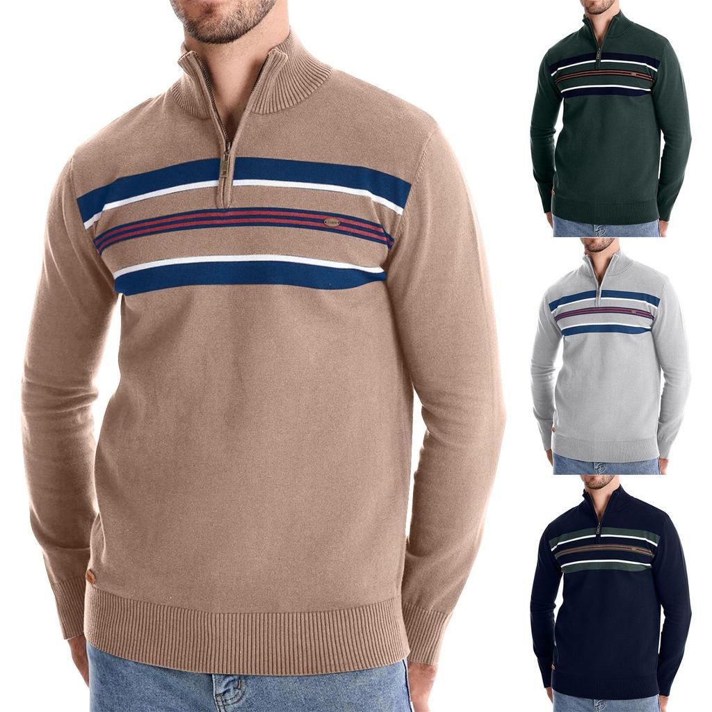 Мужской зимний повседневный полосатый трикотажный топ с воротником-стойкой и полумолнией, облегающий покрой, с длинным рукавом