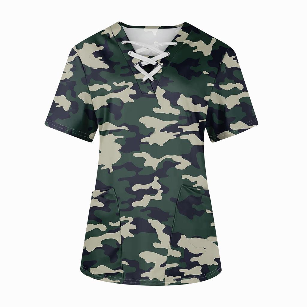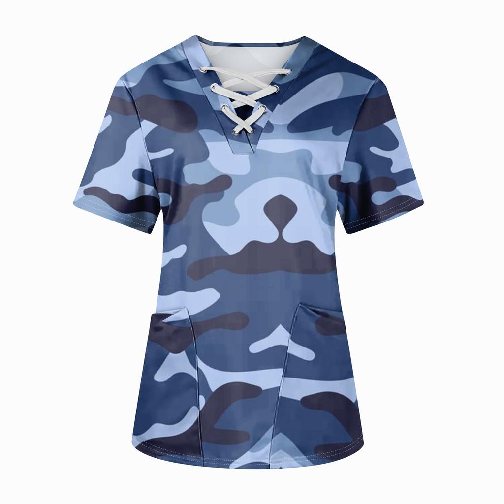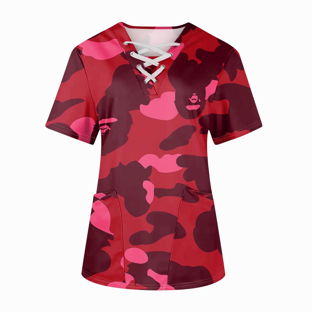 Плюс размерСкраб с принтом Рабочая форма Топы для женщин Крест V-образным вырезом Хэллоуин Принт с короткими рукавами Забавные футболки Спецодежда Футболка с карманами