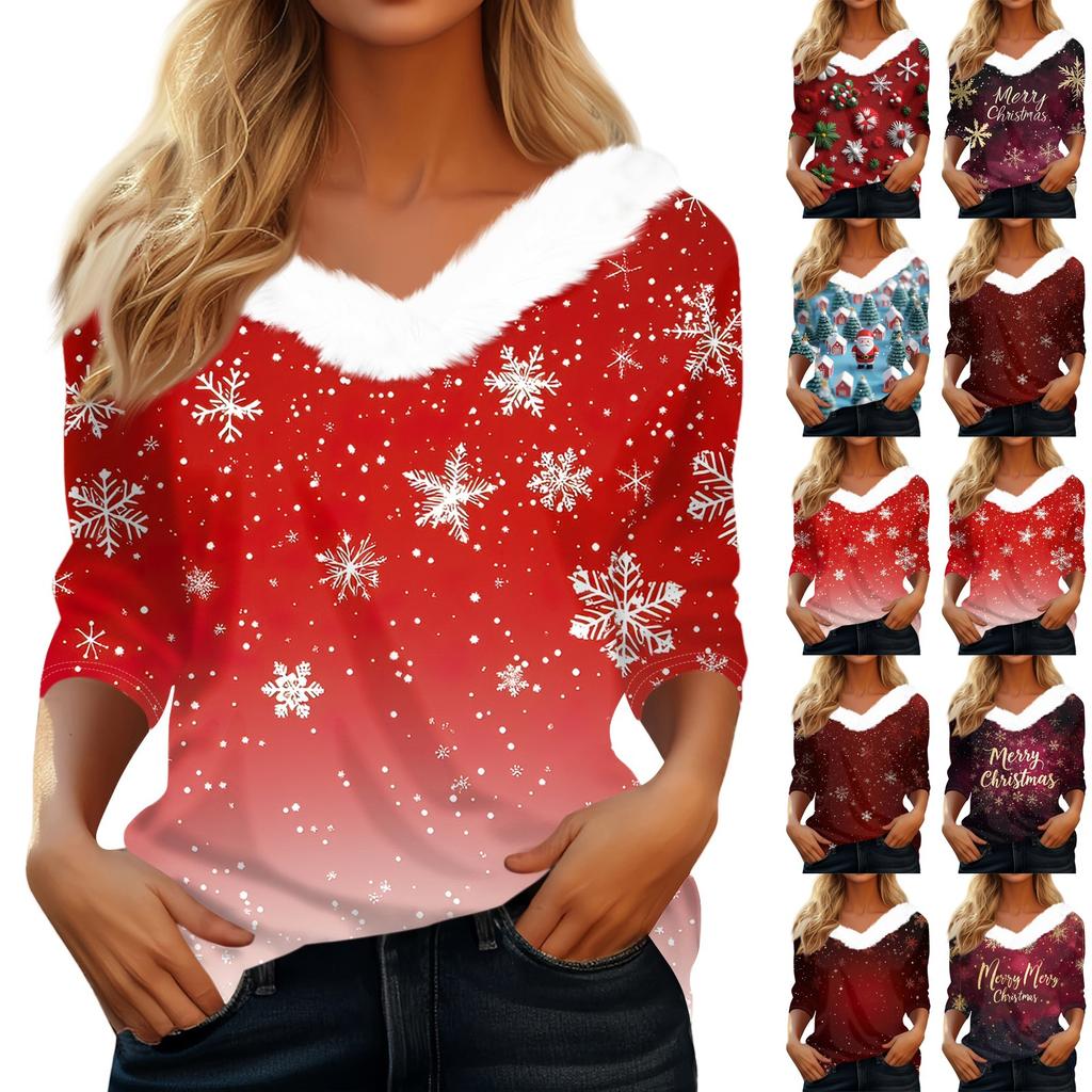 Рубашки с рукавом 3/4 для женщин, рождественские футболки с графическим принтом, блузки, повседневные базовые топы на пуговицах больших размеров, пуловеры