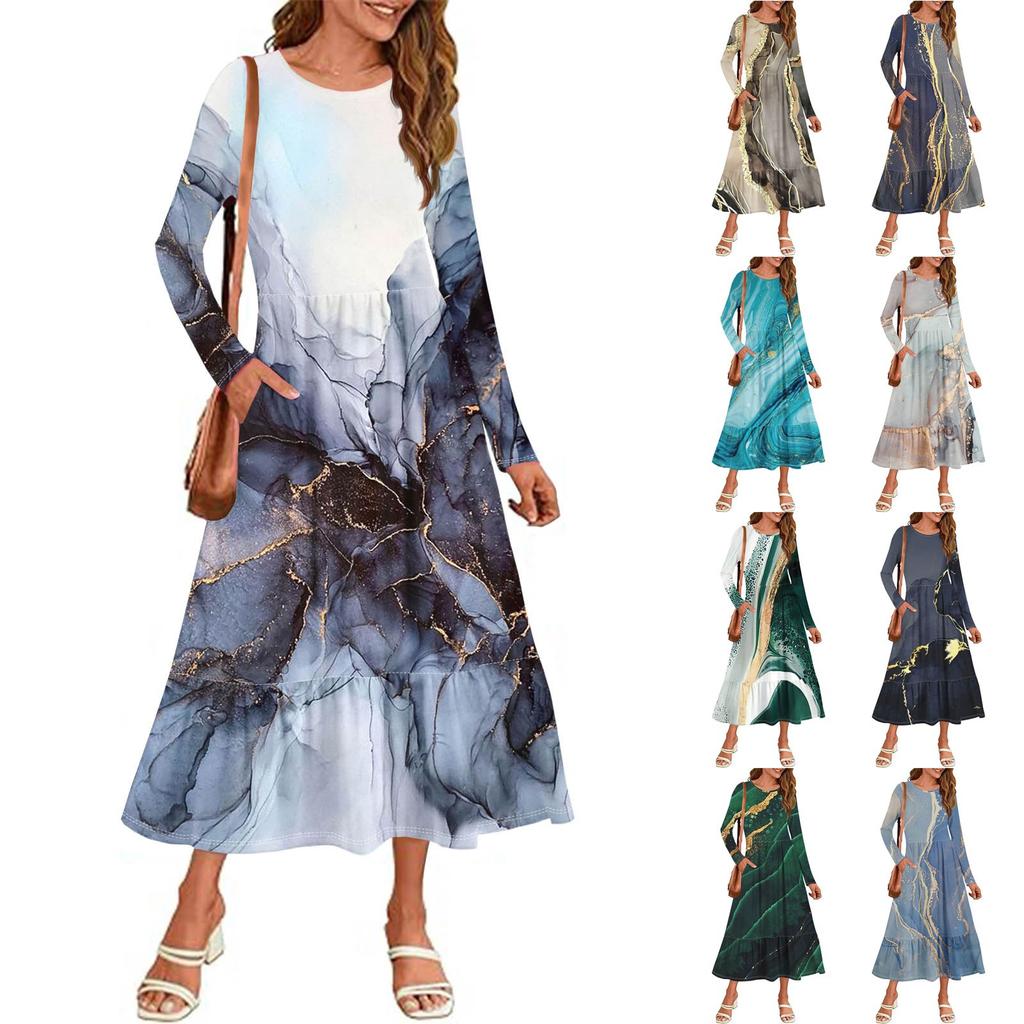 Женское повседневное платье с принтом, весна-осень, карман, круглый вырез, длинные рукава, платья