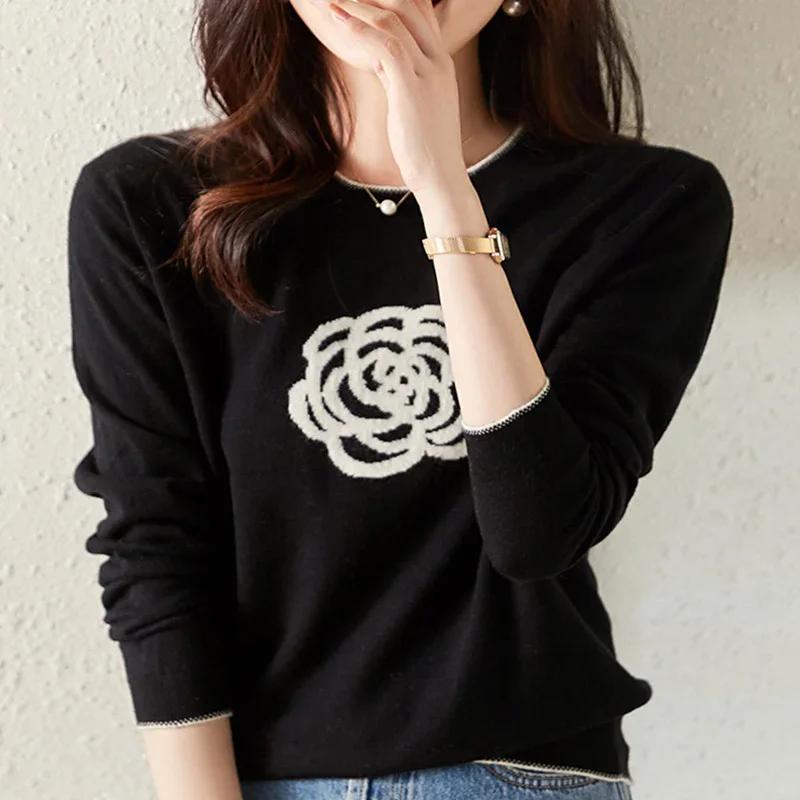 Весна Осень Женский Круглый Вышитый Шерстяной Вязаный Свитер Контрастного Цвета Элегантный Жаккардовый Тип
