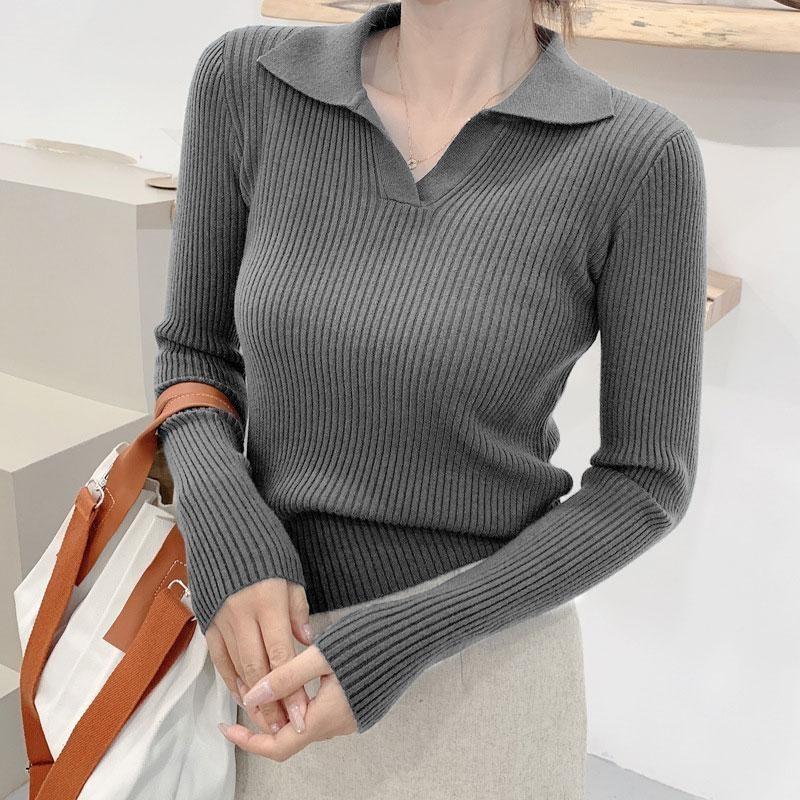 Трикотажные пуловеры с вырезом поло, свитера, женские осенне-зимние рубашки для начинающих, рубашка с длинным рукавом и отложным воротником, короткие джемперы, однотонные топы, один размер