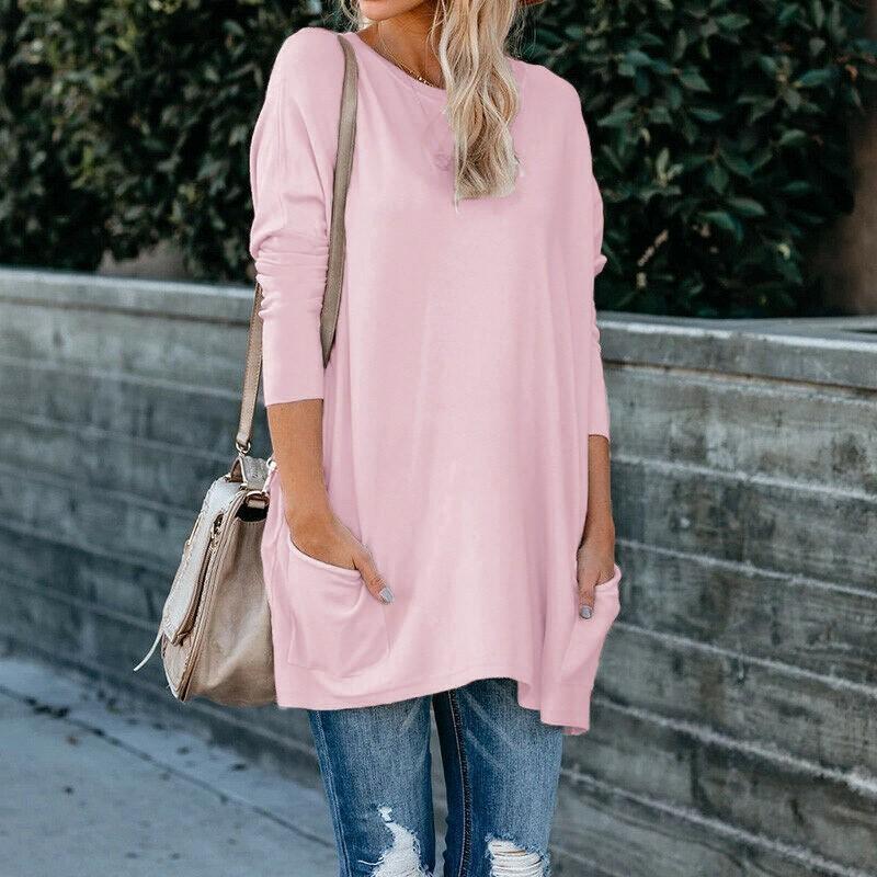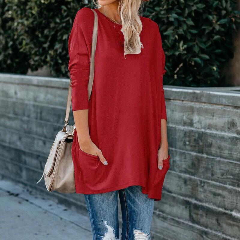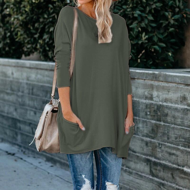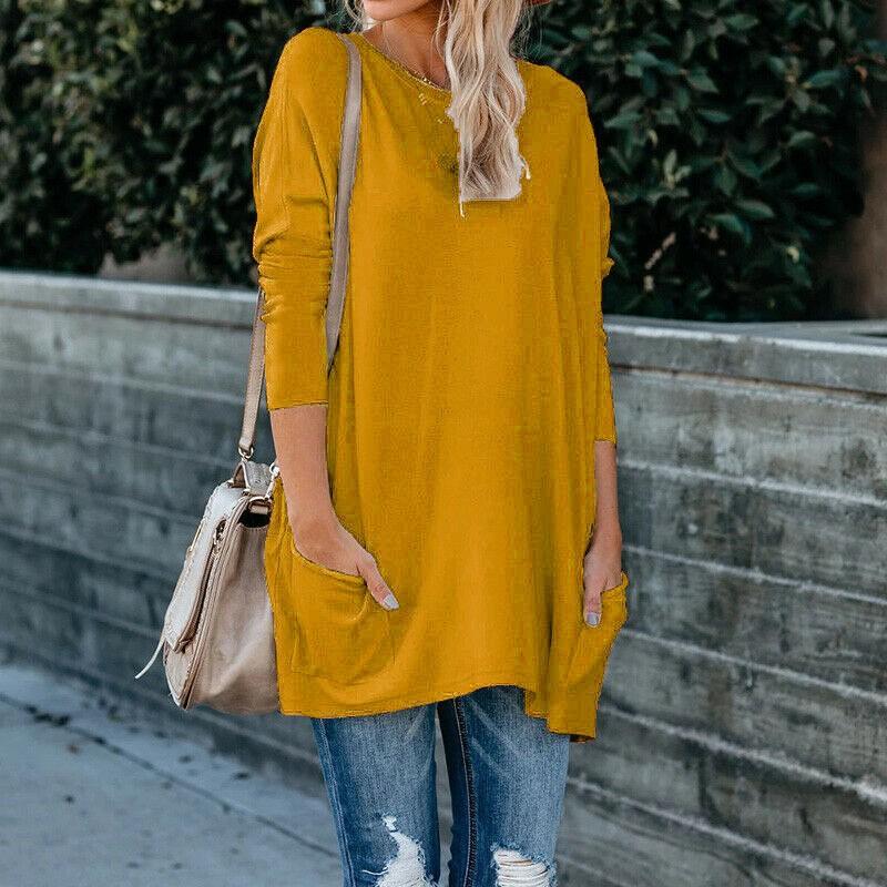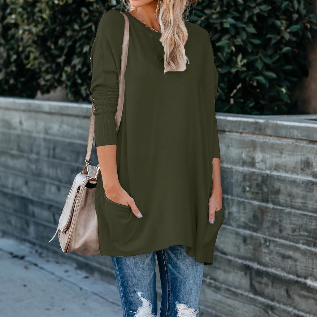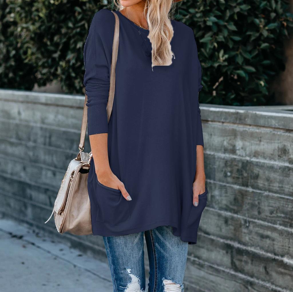 Женская футболка с круглым вырезом и длинным рукавом, топ с карманами, одежда больших размеров