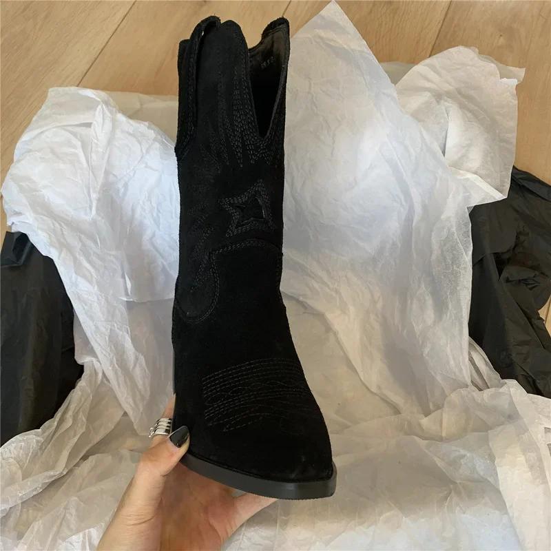 Натуральные вышитые женские сапоги из кожи ручной работы с острым носком и каблуком-шипом, осенне-зимние сапоги в ковбойском стиле в стиле ретро