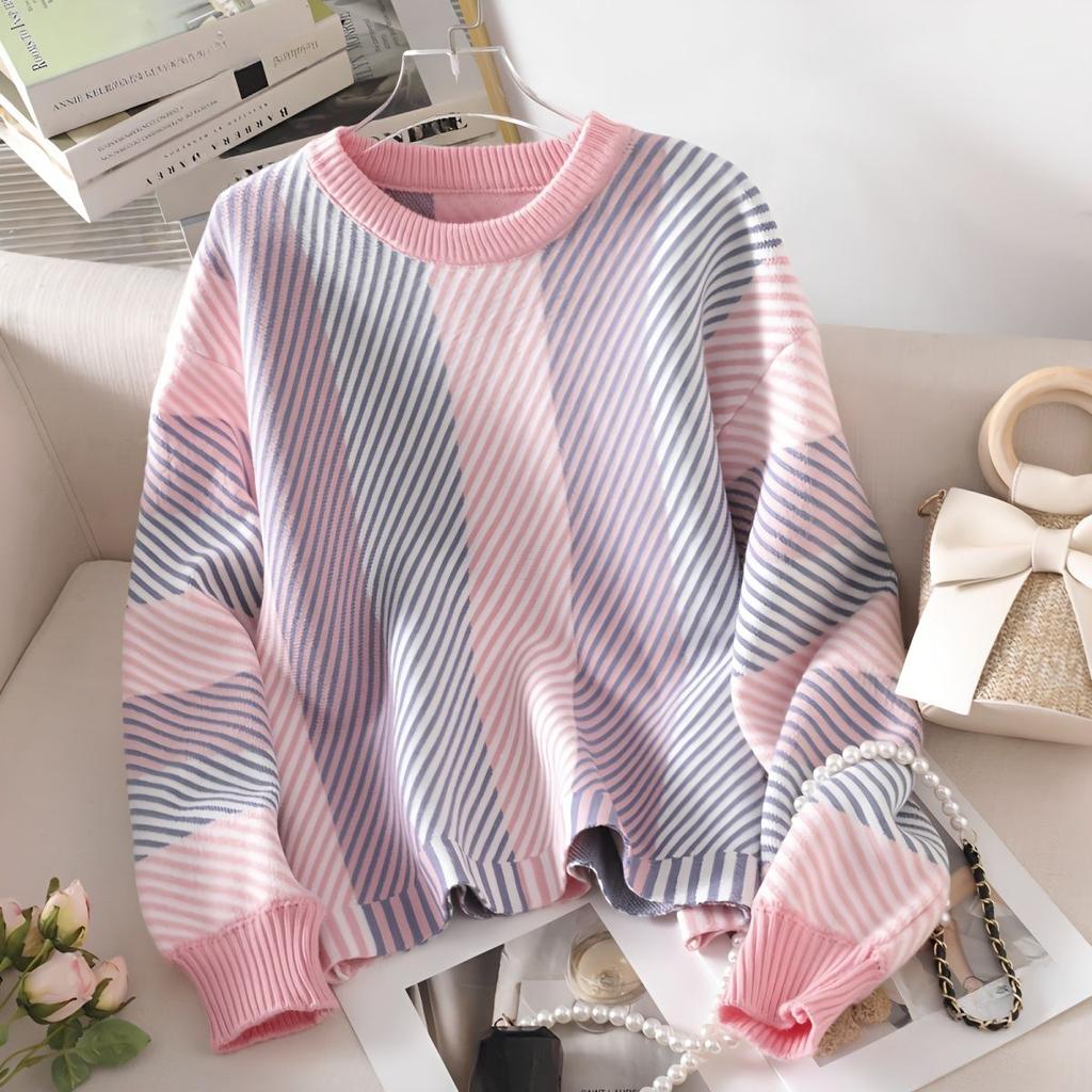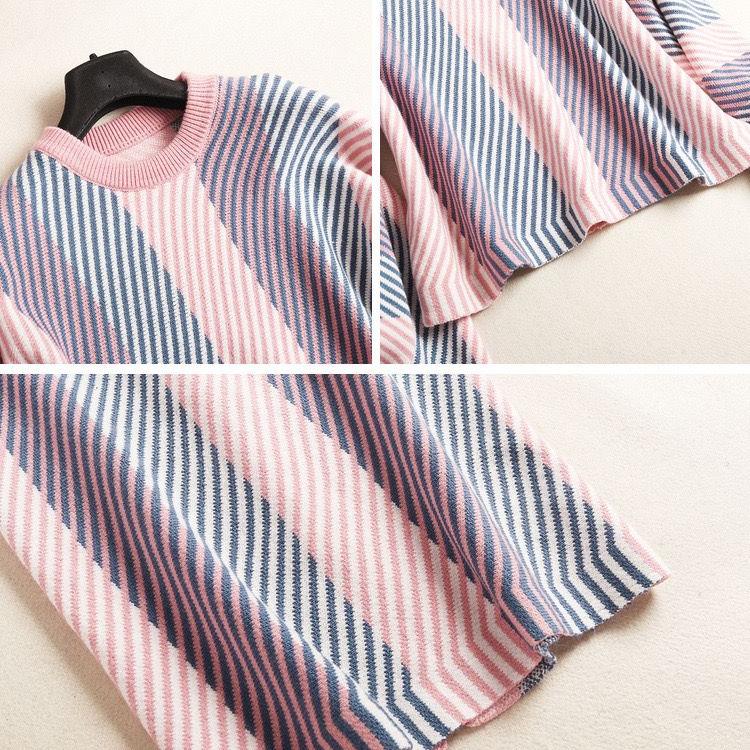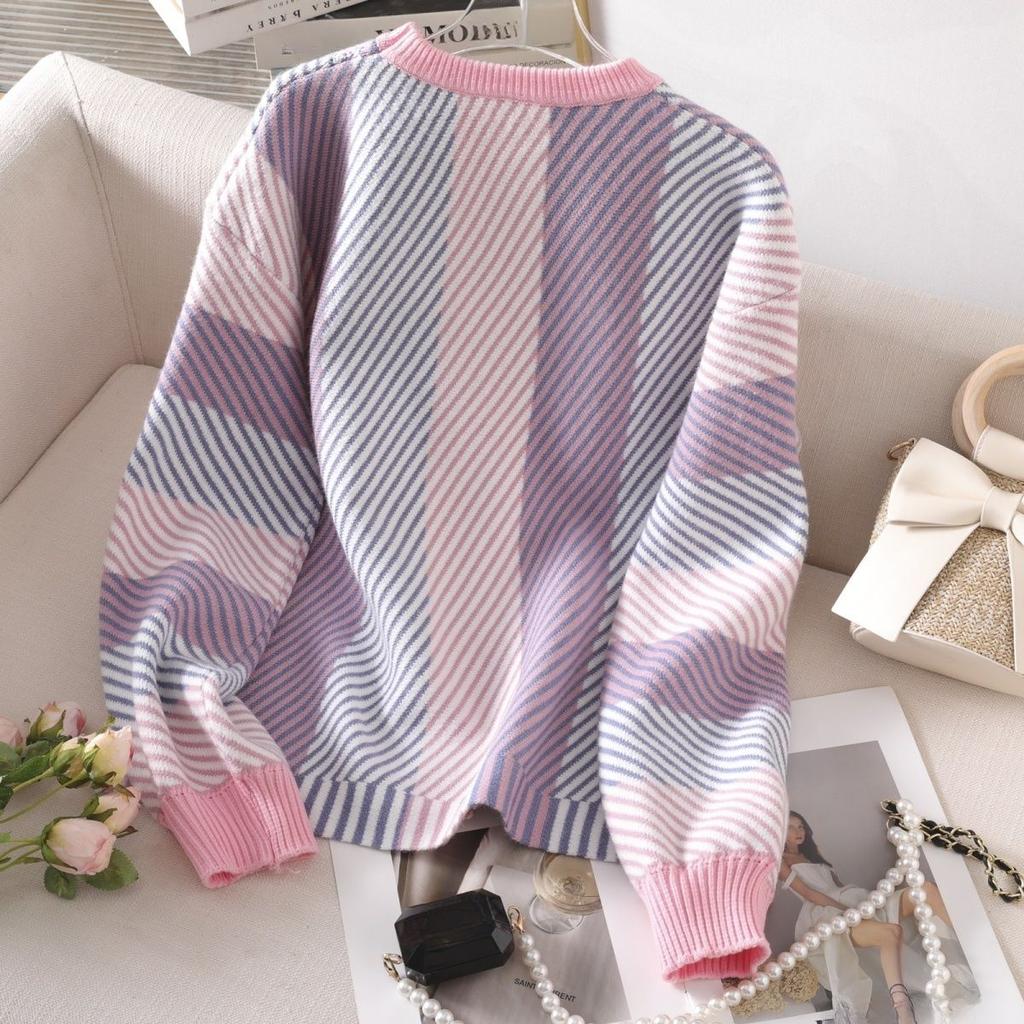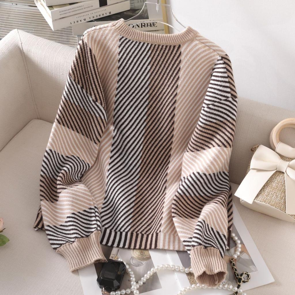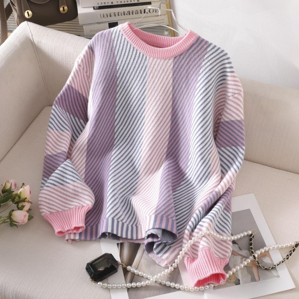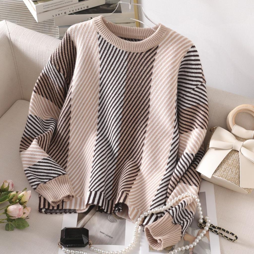 Осень/Зима Женский свитер с круглым вырезом Свободный полосатый пуловер Трикотажный свитер Повседневный джемпер с цветными блоками