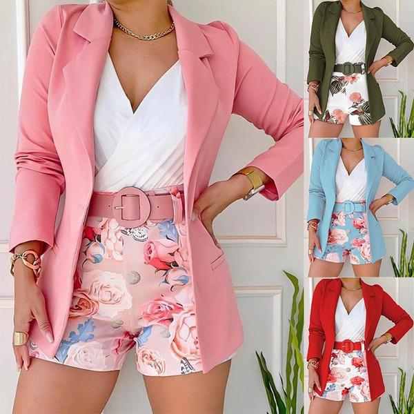 Женский костюм с длинными рукавами + шорты, мягкие однотонные деловые офисные блейзеры, женская куртка + брюки с цветочным принтом + ремень, комплект из трех предметов — купить товар онлайн с бесплатной доставкой по всему миру!