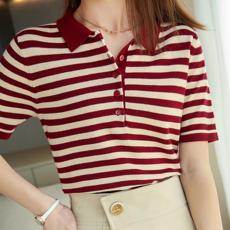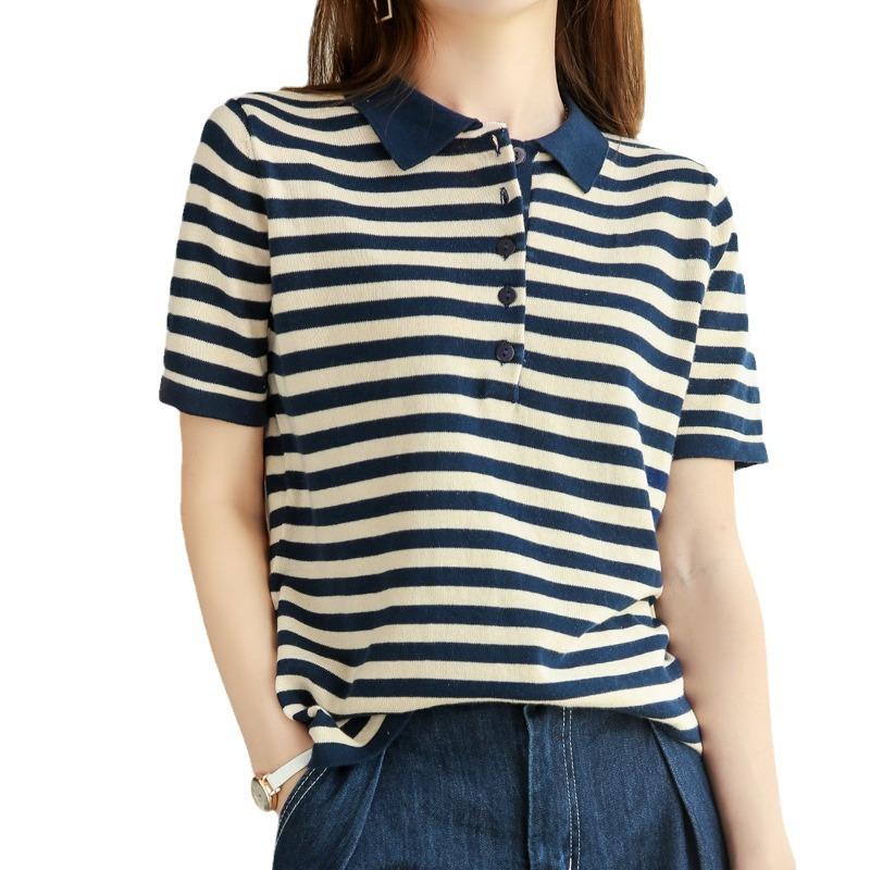 IHUASU Женская полосатая хлопковая футболка с воротником-поло, женский свитер из хлопка и льна с коротким рукавом и трикотажным низом