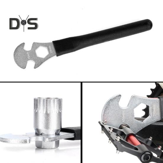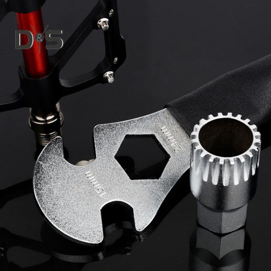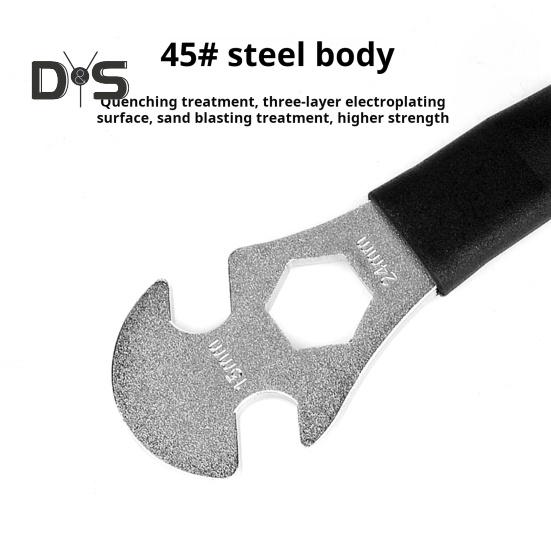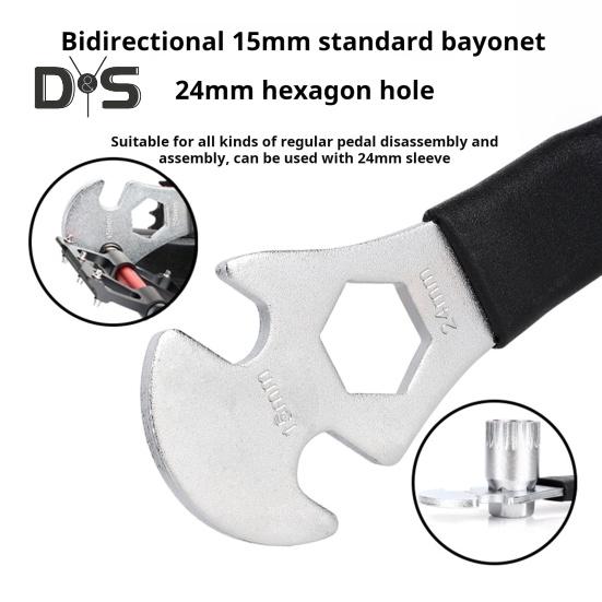 Универсальная совместимость педалей: Этот ключ, оснащенный двухсторонними стандартными пазами 15 мм и внутренним шестигранным отверстием 24 мм, идеально подходит для разборки и сборки различных обычных педалей, совместимых с втулками 24 мм.