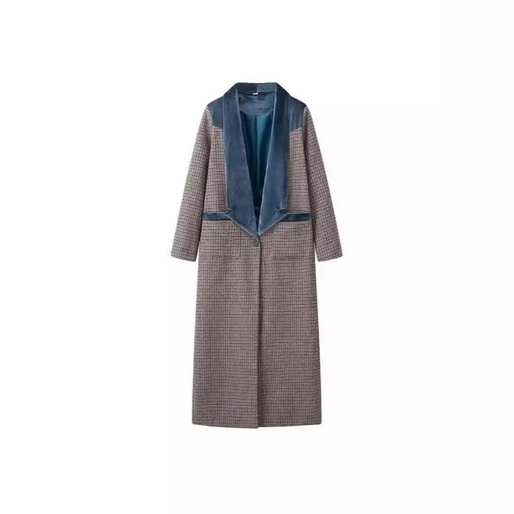 Женская одежда больших размеров, осенне-зимнее шерстяное пальто, длинное пальто с синей бархатной строчкой на плечах и воротнике