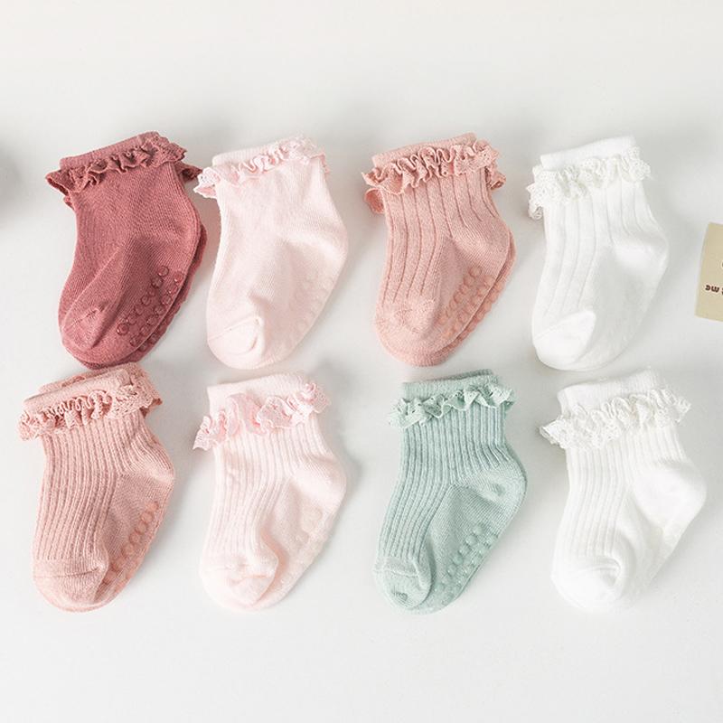 Милые детские носки для девочек, кружевные детские короткие носки с оборками, однотонные нескользящие детские носки с резиновой подошвой