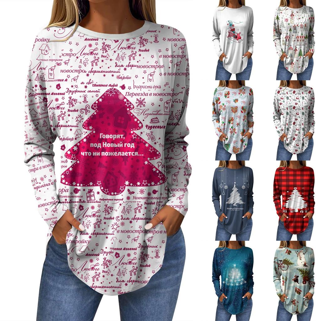 Женская модная повседневная футболка с круглым вырезом и длинным рукавом с рождественским принтом — купить товар онлайн с бесплатной доставкой по всему миру!