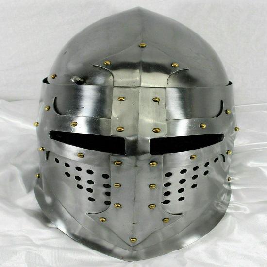 Аутентичный дизайн: Этот шлем-бацинет, изготовленный с особым вниманием к деталям, в точности воссоздает культовый головной убор средневековых рыцарей.. Он оснащен забралом, закрывающим все лицо, защитой шеи и классической конической формой, которая перенесет вас во времена рыцарских турниров и героических сражений.