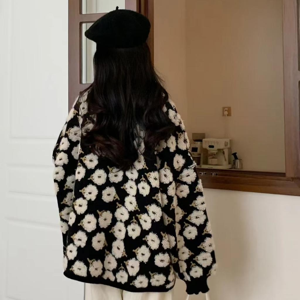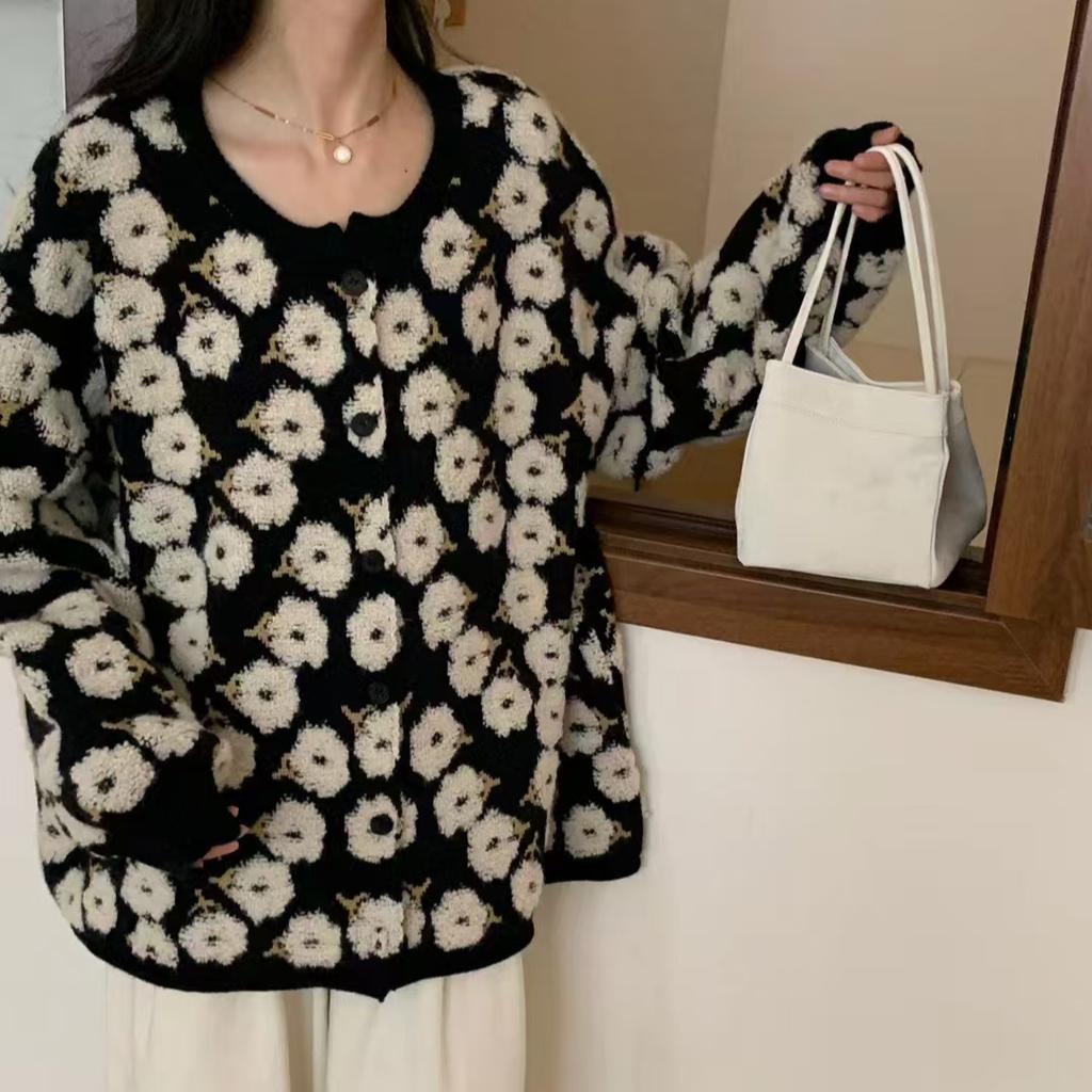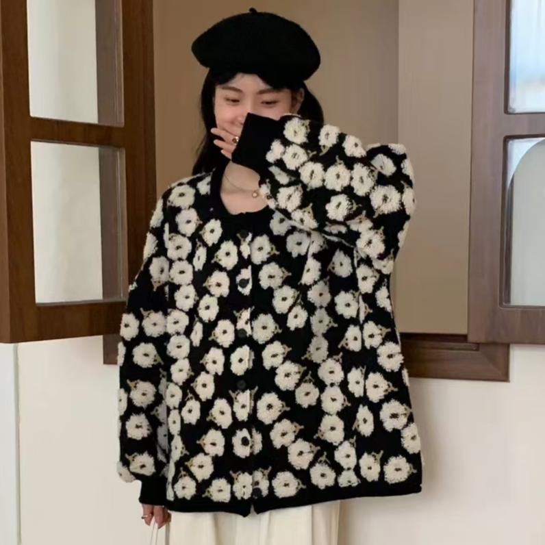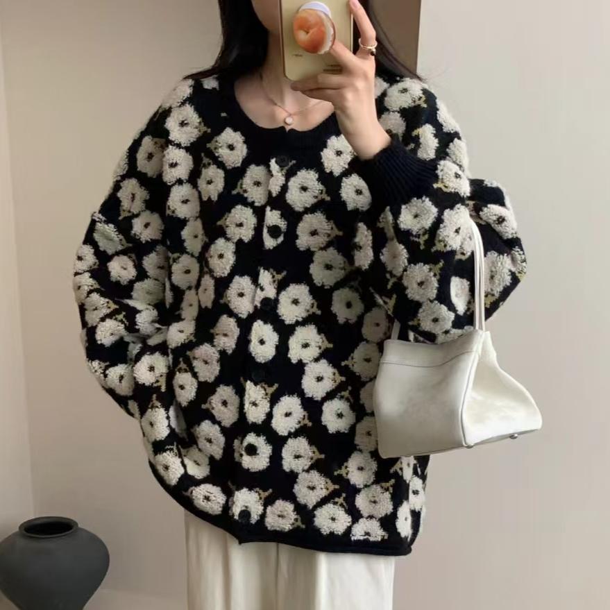 Dimanaf 2024 Плюс Размер Осеннее Пальто Женские Пуговицы Цветочные Свитера Куртка Вязание Оверсайз Повседневный Черный Стиль Свободный Кардиган Свитер