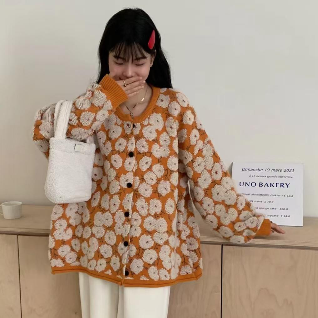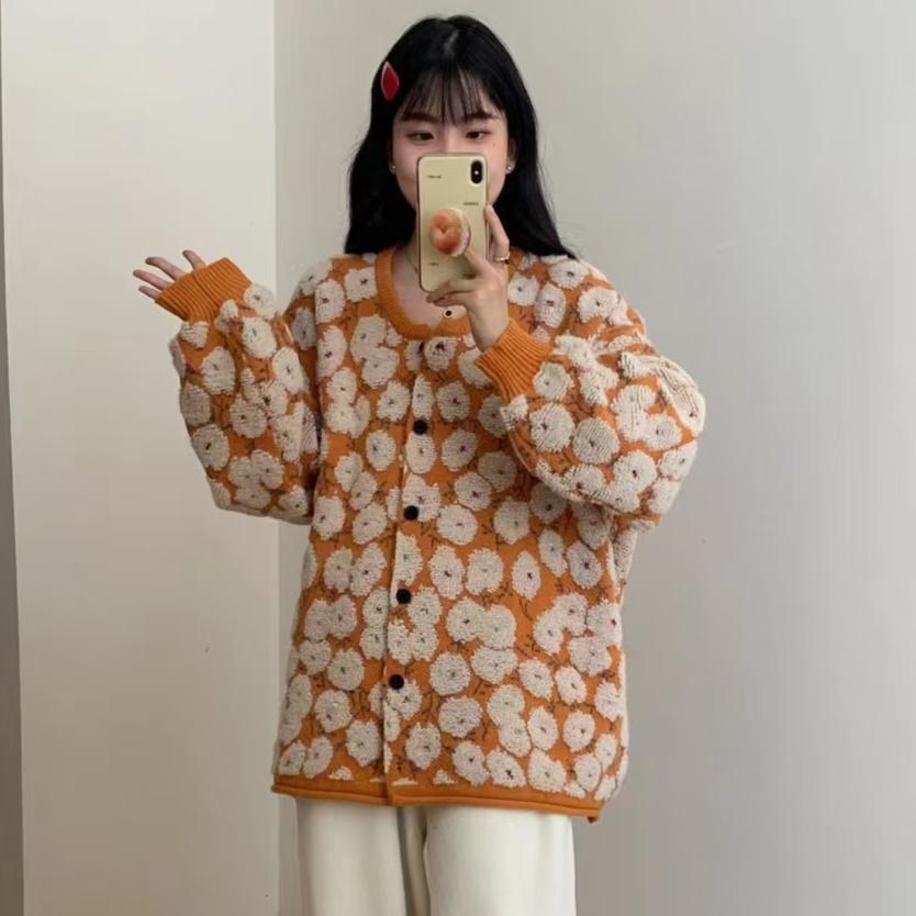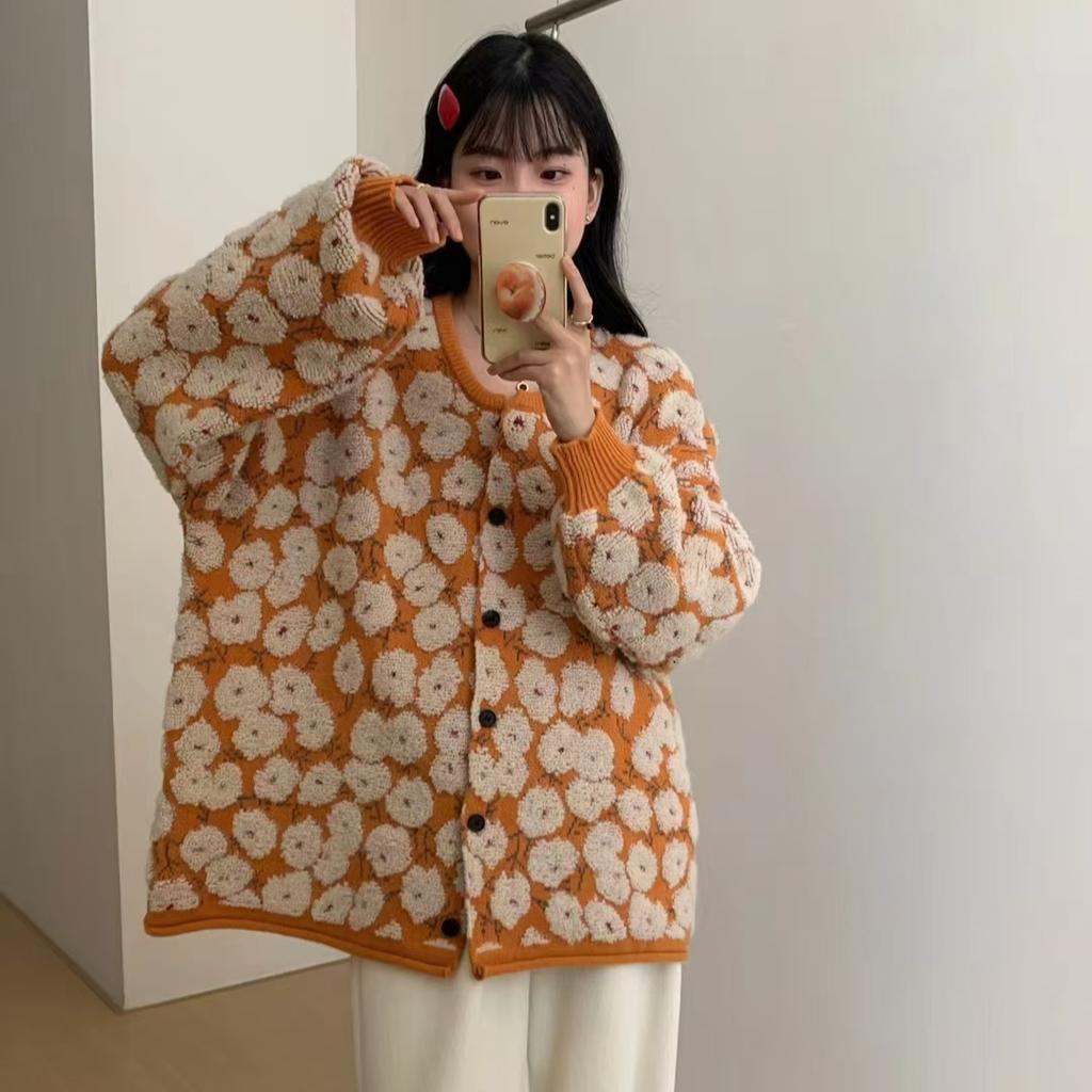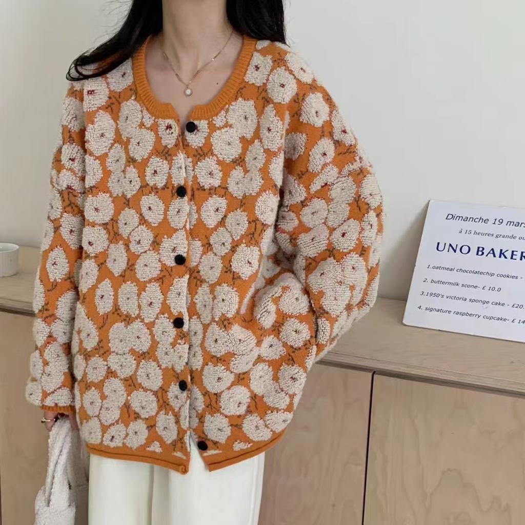Dimanaf 2024 Плюс Размер Осеннее Пальто Женские Пуговицы Цветочные Свитера Куртка Вязание Оверсайз Повседневный Черный Стиль Свободный Кардиган Свитер