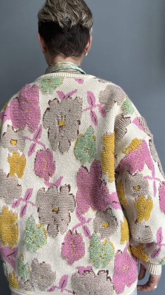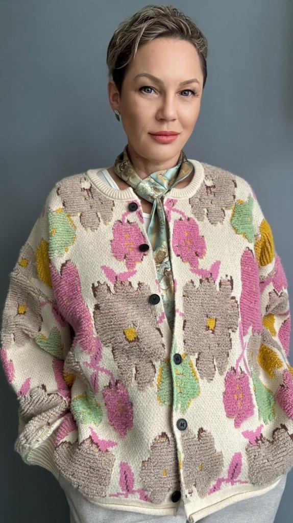 Теплый кардиган с цветами ✔️Размер и цвет единый Мои параметры: 167, 98-85-100. Сел свободно, подойдет на параметры больше моих и более высокий рост ✔️Фасон: Горловина круглая Плечи спущенные Силуэт прямой Тип застежки- пуговицы На рукавах вязаные манжеты Низ произвольно подворачивается вверх, маленькой колбаской ✔️Ткань: Толстая, теплая, хорошо тянется Акрил, не колется, электризуется Цветы фактурные, как махровое полотенце ✔️Особенности: Очень удачное сочетание цветов: теплое, весенние Диманаф много лет продает такие кардиганы, все они имеют одну особенность : отверстия для пуговиц не обработаны ✔️Пошив аккуратный 📐Замеры: Плечи 65 Длина рукава от горловины 73 Длина рукава от подмышки 48 Ширина рукава в предплечье 23 ОГ подмышками 132 ОТ 130 ОБ 128 Длина 68