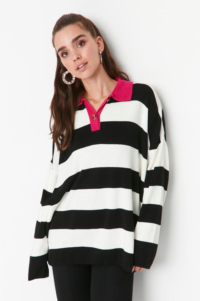 Women's Fashionable Stylish Hijab Sweater Black Striped Polo Neck Knitwear Sweater — купить товар онлайн с бесплатной доставкой до всему миру!